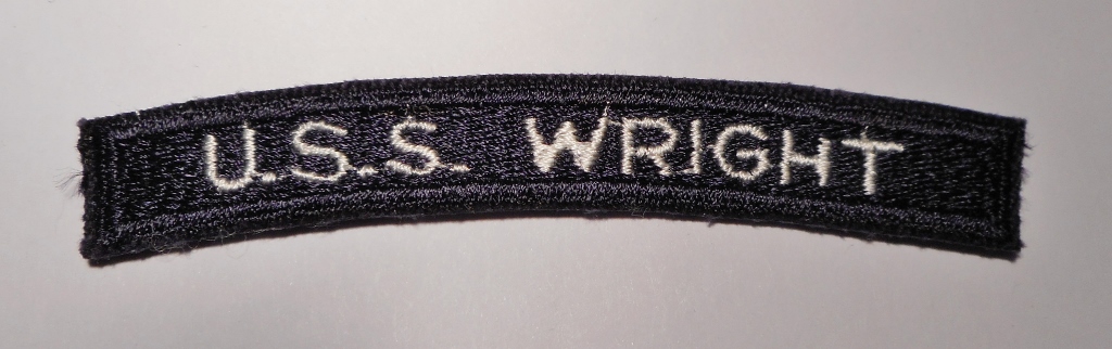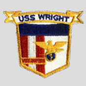 86k | Jacket patch of the ship's insignia. Its design is based on the National shield, with an American eagle and globe in the lower right. The lightning bolt in the eagle's talons represents command and communications, Wright's mission. The motto "Vox Imperii" is translated "voice of the leaders." The original patch was received from USS Wright in 1970. U.S. Naval Historical Center Photograph (# NH 69468-KN). |
