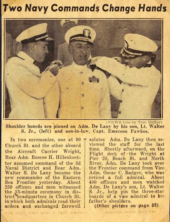 197k | "In two ceremonies, one at 90 Church St. and the other aboard the Aircraft Carrier Wright, Rear Adm. Roscoe H. Hillenkoetter assumed command of the 3d Naval District and Rear Adm. Walter S. De Lany became the new commander of the Eastern Sea Frontier yesterday. About 250 officers and men witnessed the 13-minute ceremony in district headquarters in Church St. in which both admirals read their orders and exchanged farewell salutes. Adm. De Lany then reviewed the staff for the last time. Shortly afterward, on the Flight deck of the Wright at Pier 26, Beach St. and North River, Adm. De Lany took over the Frontier command from Vice Adm. Oscar C. Badger, who was retired a full admiral. About 400 officers and men watched Adm. De Lany's son, Lt. Walter S. Jr., help pin the three-star boards of a vice admiral to his father's shoulders." |