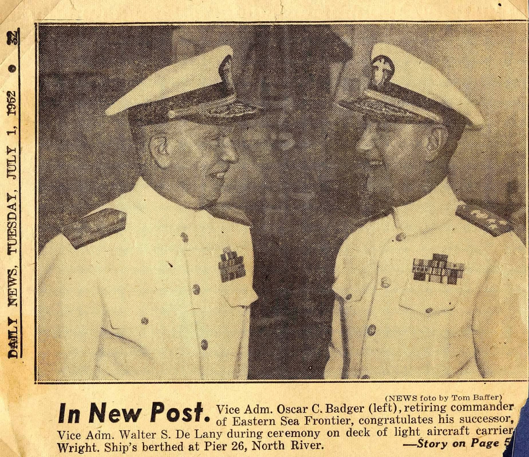 924k | "In New Post. Vice Adm. Oscar C. Badger (left), retiring commander of Eastern Sea Frontier, congratulates his successor, Vice Adm. Walter S. De Lany during ceremony on deck of light aircraft carrier Wright. Ship's berthed at Pier 26, North River." Daily News, Tuesday, July 1, 1952. |
