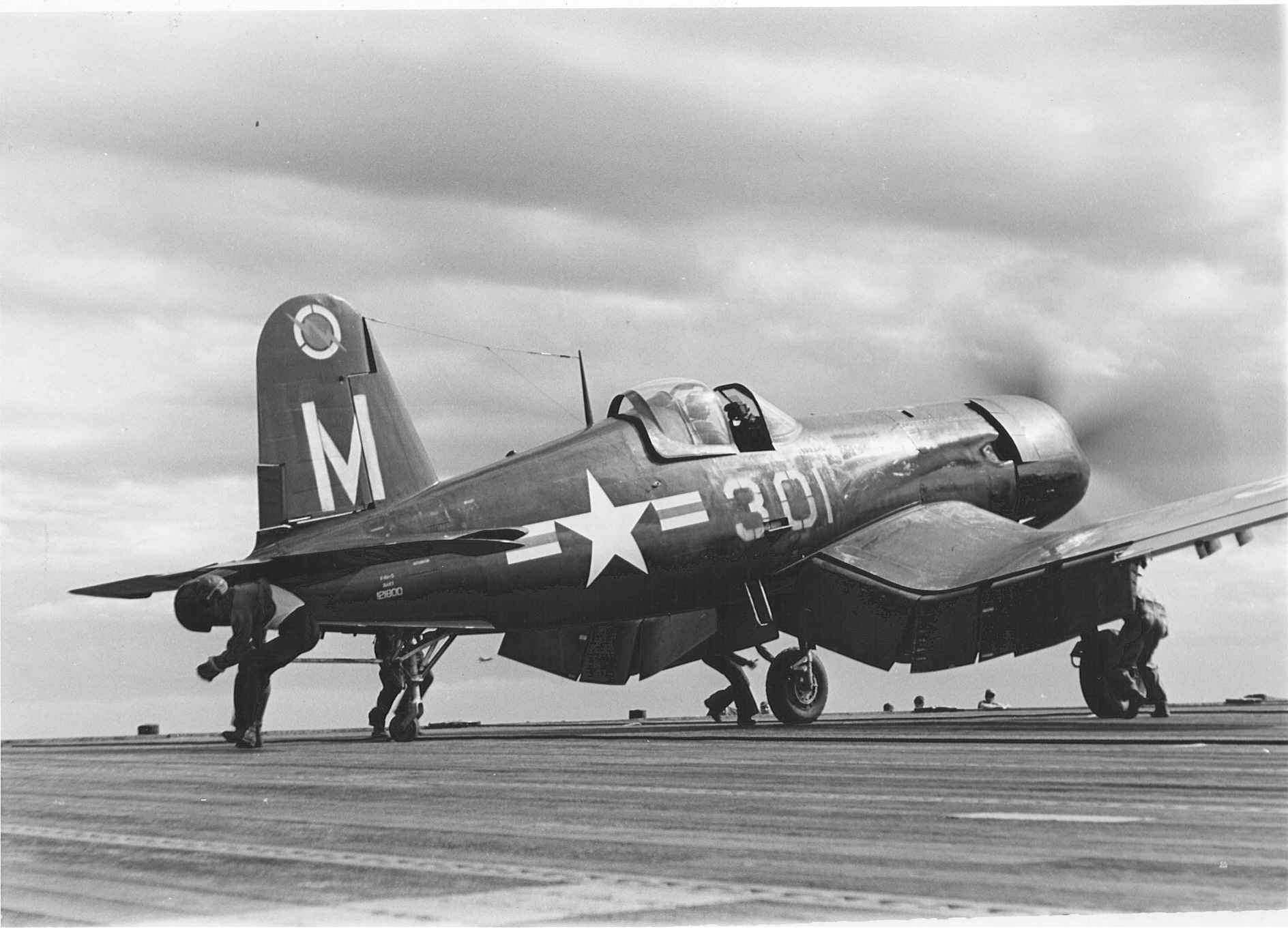 979k | A United States Navy (USN) Vought F4U-5 Corsair (BuNo 121800, modex M-301) of Fighter Squadron (VF) 23 "Flashers" on the deck of the light aircraft carrier USS Wright (CVL-49), November 1948. USN photo. |