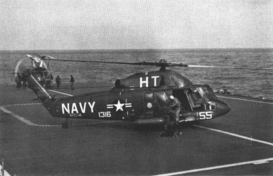 261k | The crew of a U.S. Navy Kaman UH-2B Seasprite (BuNo 151316, modex HT-55) of Helicopter Combat Support Squadron (HC) 4 "Invaders" makes the 1000th landing aboard the command ship USS Wright (CC-2), circa 1966. |