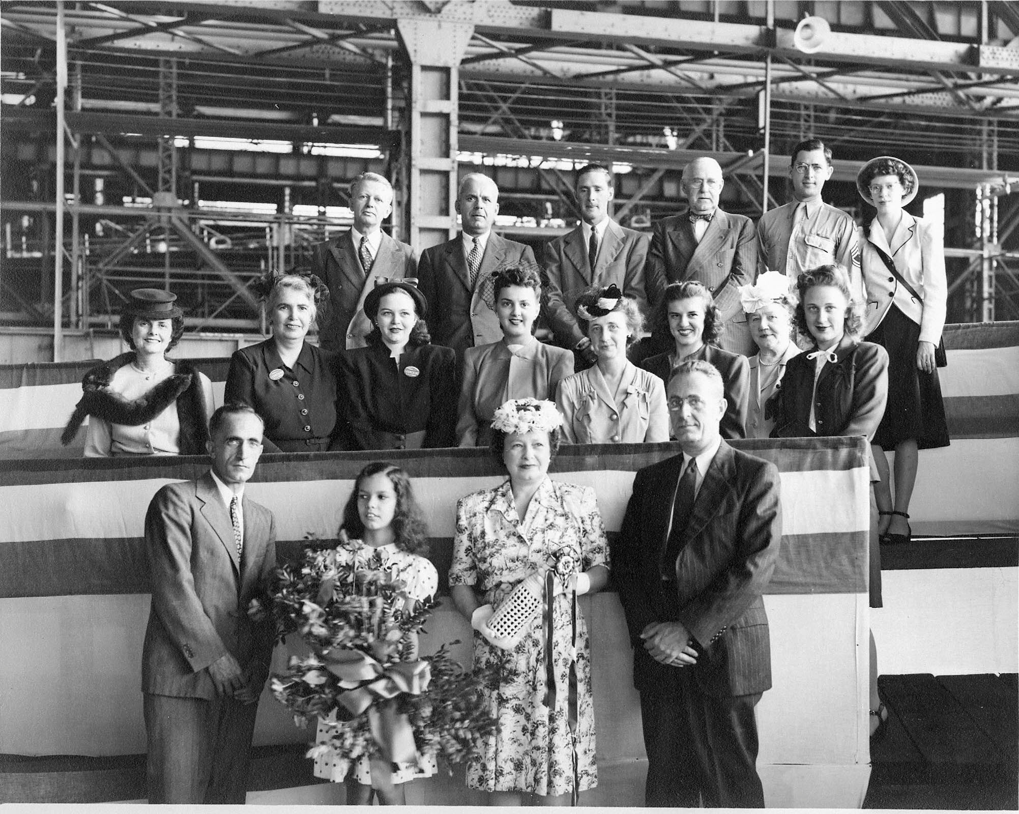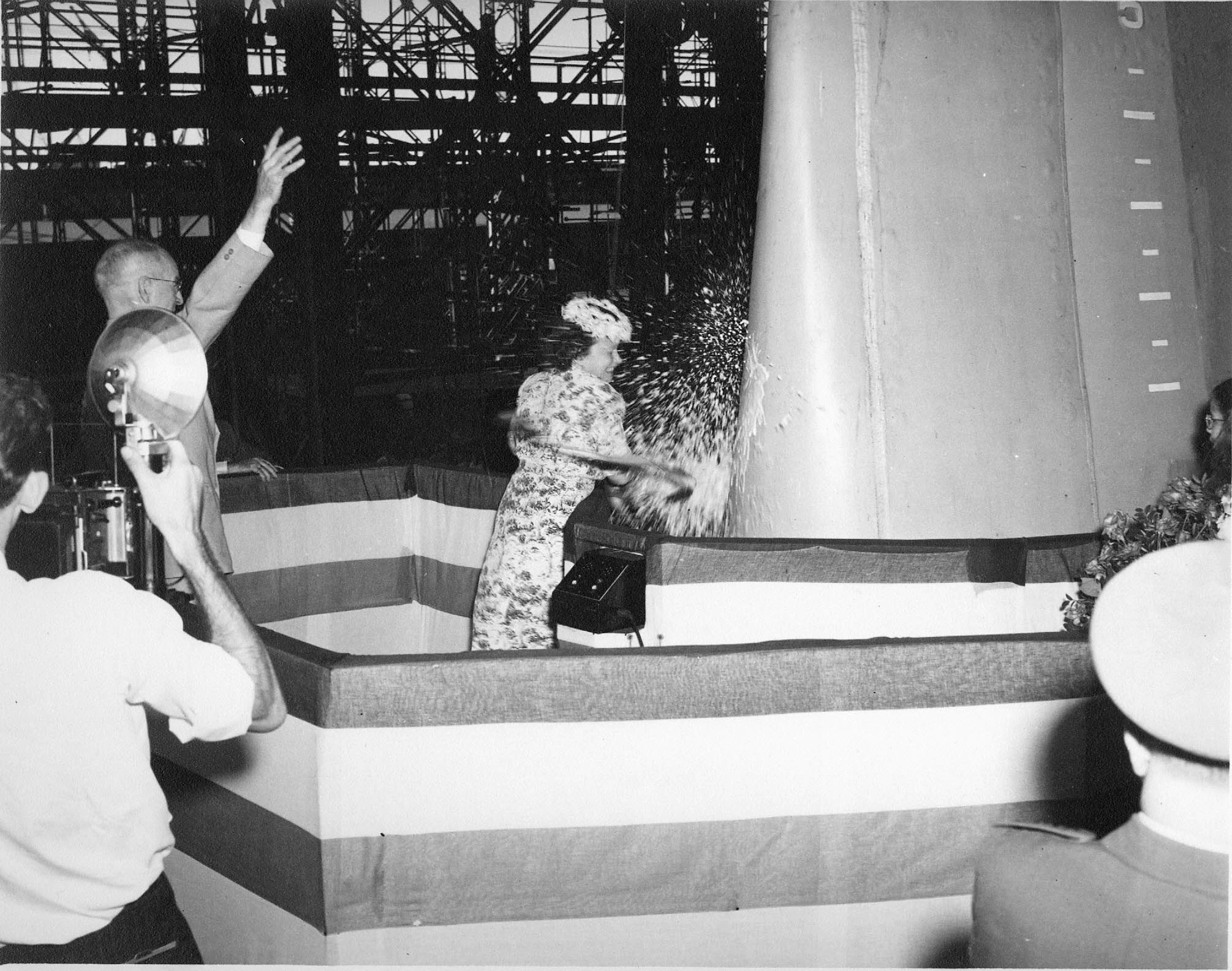 529k | Mrs. Harold S. Miller (née Ivonette Wright) christening the ship. Ivonette was a niece of the Wright Brothers (daughter of their older brother, Lorin) and the last living person who flew with Orville. Her husband was a World War I Army Signal Corps pilot in France. |