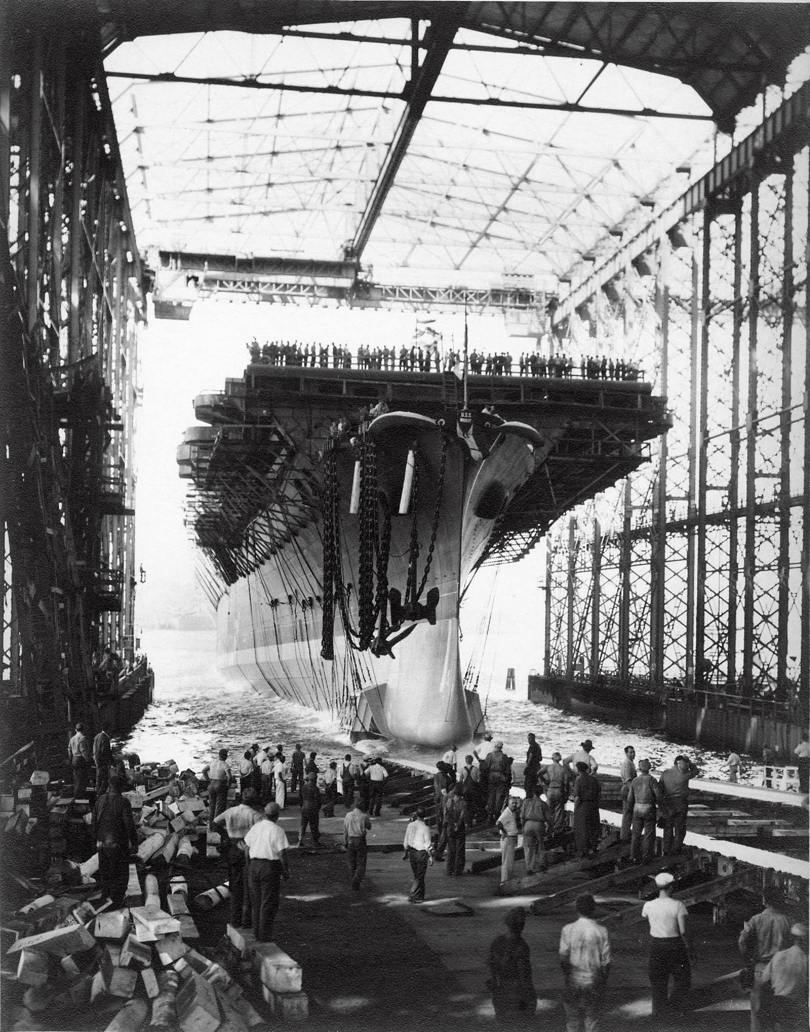 692k | The future USS Wright (CVL-49) sliding down the ways. |