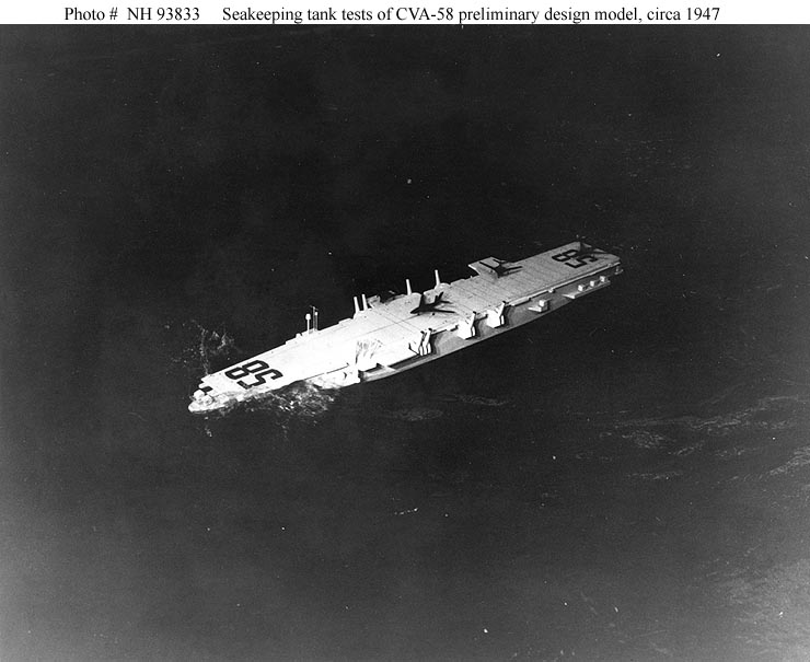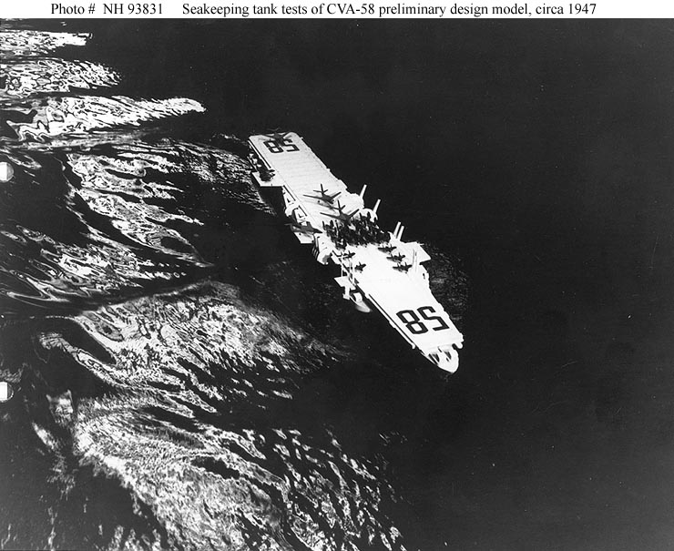 104k | Preliminary design model of the future USS United States (CVA-58) undergoing seakeeping tests at the David Taylor Model Basin, Carderock, Maryland, circa 1947. This is an early version of the CVA-58 design, without catapult sponsons. Aircraft models on the flight deck appear to represent the F7U fighter and a notional heavy attack bomber. Copied from photographs in File F-3, B-36 Carrier Characteristics File in the records of OP-23, held by the Operational Archives Branch, Naval Historical Center, 1982. NS025802: Note the folding smokestacks in the "up" position. U.S. Naval History & Heritage Command photo (# NH 93831). NS025802a: Note the folding smokestacks in the "down" position, as they would have been during flight operations. U.S. Naval History & Heritage Command photo (# NH 93832). NS025802b: Note the folding smokestacks in the "up" position and large amount of water splashed out around the bow. U.S. Naval History & Heritage Command photo (# NH 93833). NS025802c: Note the folding smokestacks in the "down" position. U.S. Naval History & Heritage Command photo (# NH 93834). |