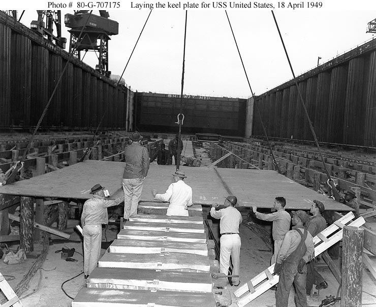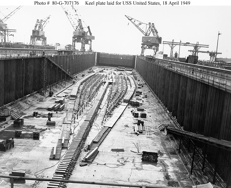 124k | Ship's keel plate being laid in a construction dry dock at the Newport News Shipbuilding and Dry Dock Company shipyard, Newport News, Virginia, 18 April 1949. The carrier was cancelled a few days later, on 23 April. Official U.S. Navy Photograph, now in the collections of the National Archives (# 80-G-707176). |
