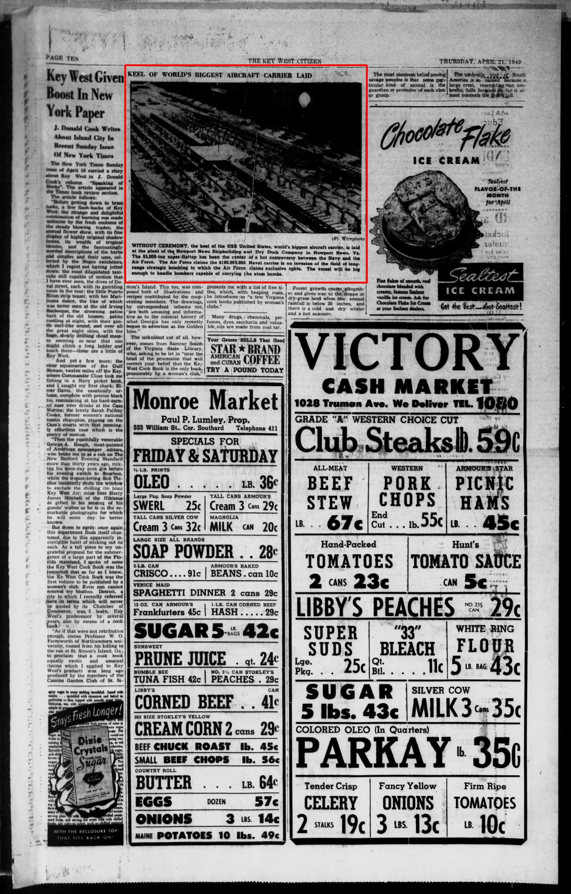1.10M | "KEEL OF WORLD'S BIGGEST AIRCRAFT CARRIER LAID—WITHOUT CEREMONY, the keel of the USS United States, world's biggest aircraft carrier, is laid at the plant of the Newport News Shipbuilding and Dry Dock Company in Newport News, Va. The 65,000-ton super-flattop has been the center of a hot controversy between the Navy and the Air Force. The Air Force claims the $186,000,000 Naval carrier is an invasion of the field of long-range strategic bombing to which the Air Force claims exclusive rights. The vessel will be big enough to handle bombers capable of carrying the atom bombs." The Key West Citizen, Thursday, 21 April 1949, page 10. |