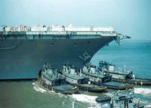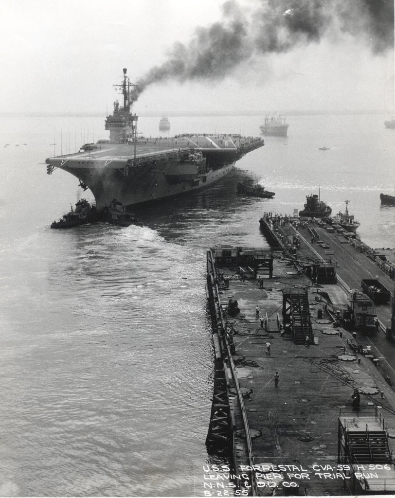 172k | Forrestal (CVA-59) leaving pier for trial run, 22 August 1955. Newport News Shipbuilding & Dry Dock Company photo. |