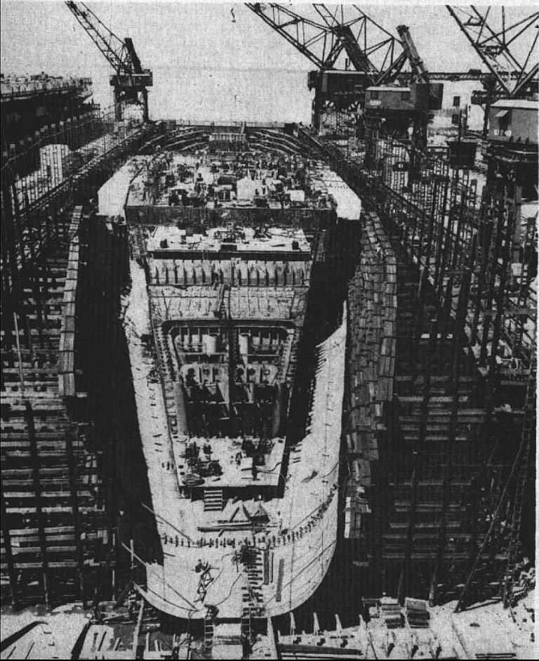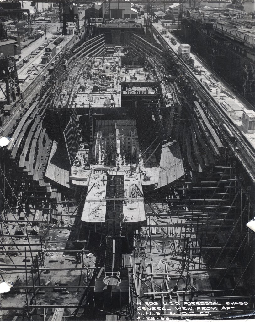 247k | Forrestal (CVA-59) under construction, general view from aft, 28 April 1953. Newport News Shipbuilding & Dry Dock Co. photo. |