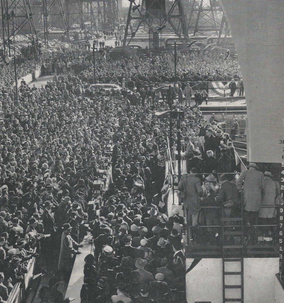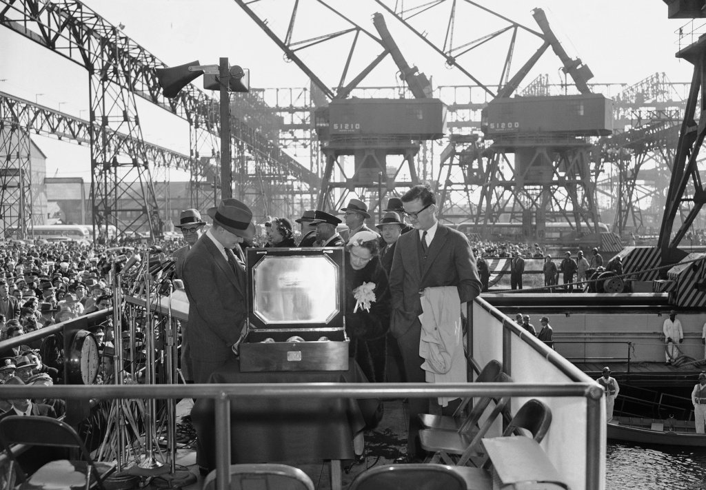 117k | Forrestal is christened by Mrs. James V. Forrestal (née Josephine Ogden Stovall). (See also NS025984.) |