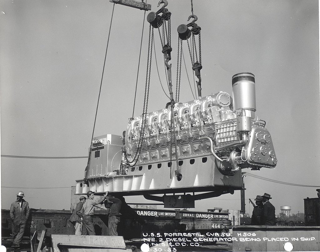 174k | No. 2 diesel generator being placed in ship, 30 ??? 1953. Newport News Shipbuilding & Dry Dock Co. photo. |