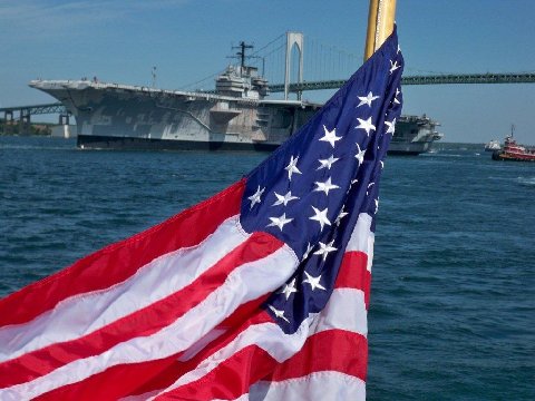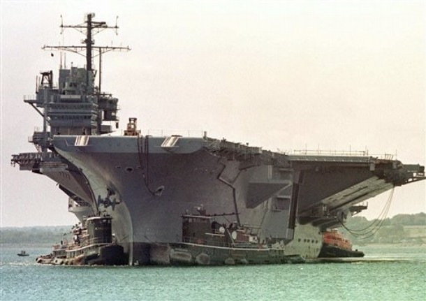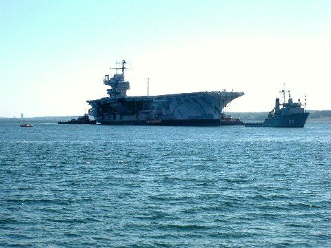 101k | The decommissioned aircraft carrier ex-USS Forrestal (AVT-59) arrives at Naval Support Activity Philadelphia from Naval Station Newport, R.I., 18 June 2010. The first of the American supercarriers, Forrestal was commissioned 1 October 1955, and was in service for almost 38 years. U.S. Navy photo by Mass Communication Specialist 2nd Class Matthew R. White (# 100618-N-1251W-029). |