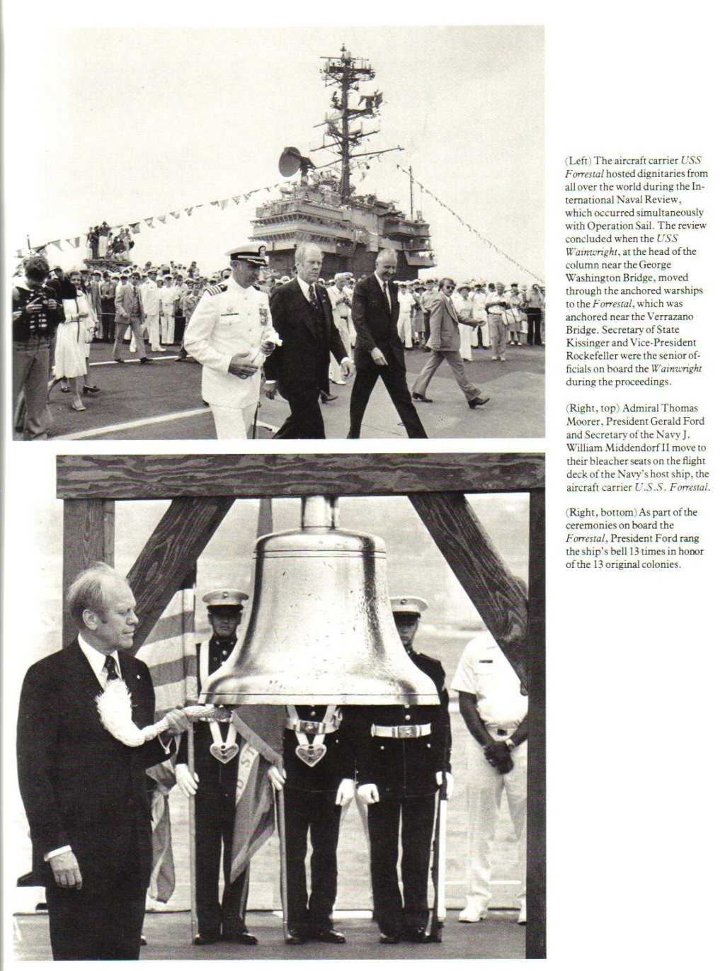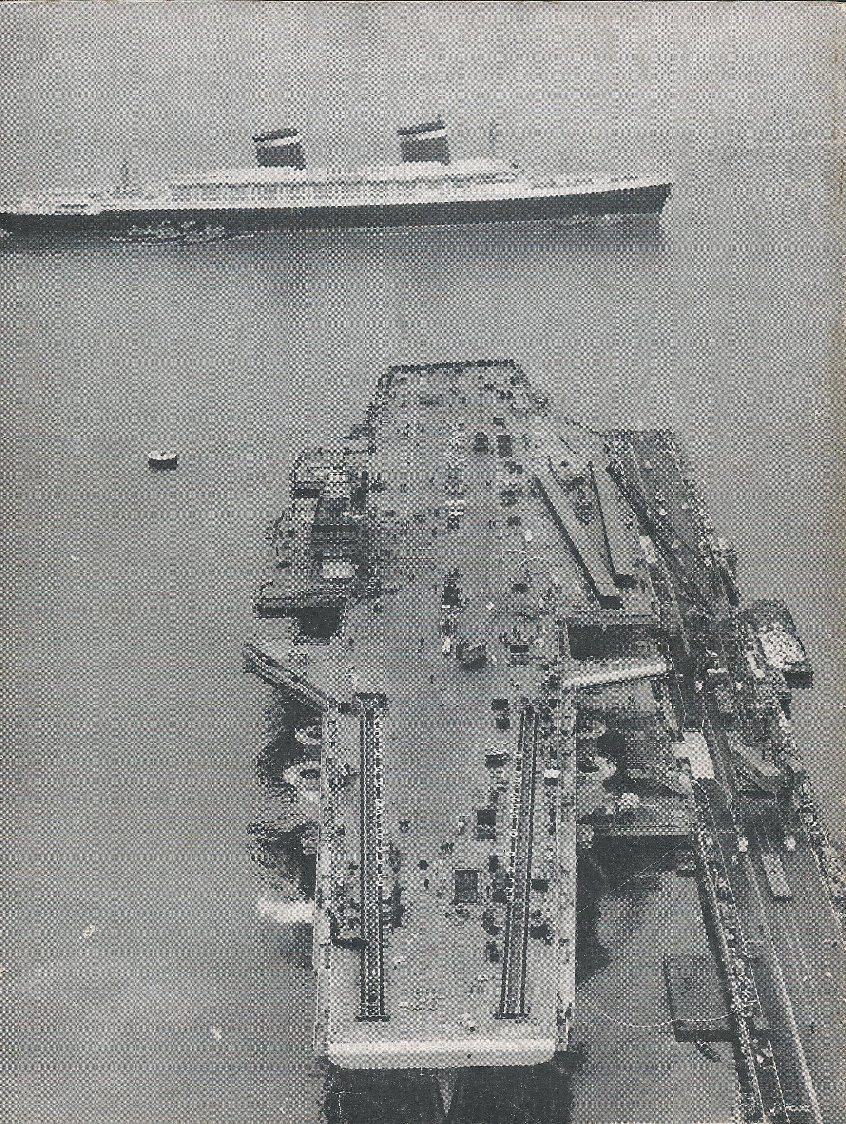 367k | Two Newport News Shipbuilding photos from Shipyard Bulletins (the former in-house publication of Newport News Shipbuilding and Dry Dock Company) taken as Forrestal was moved to her outfitting pier on 12 December 1954. NS0259feb: Forrestal being moored to the pier. To her left is the hull of the future USS Ranger. The keel for the latter was laid in the dry dock (Shipway 10) next to Forrestal; when Forrestal was launched Ranger's partially completed hull was floated out and subsequently moved to Shipway 11. NS0259fec: Ocean liner SS United States passes Forrestal, under construction. |