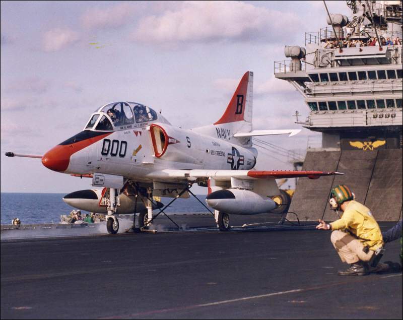 Reclassified as a Training Carrier and redesignated AVT-59, Feb 1992; Forrestal arrived in Philadelphia 14 Sept 1992 to begin a 14-month complex overhaul prior to assuming the duties as training carrier. In early 1993, however, it was decided to decommission Forrestal and leave the Navy without a dedicated training carrier. Decommissioned and stricken from the Navy List, 11 Sept 1993.