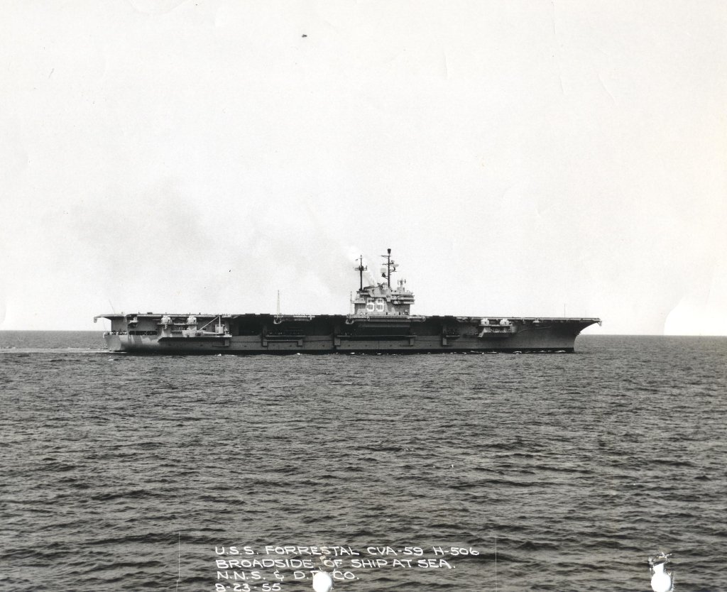 150k | Broadside view of Forrestal (CVA-59) at sea, 23 August 1955. Newport News Shipbuilding & Dry Dock Company photo. |
