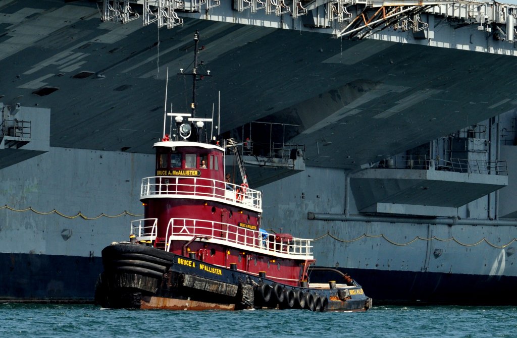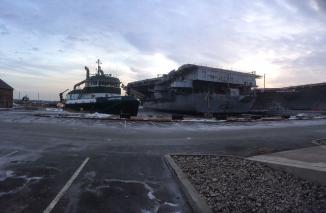 98k | Ex-USS Forrestal (AVT-59) and tugboat Lauren Foss, Naval Support Activity Philadelphia, 2 February 2014. |