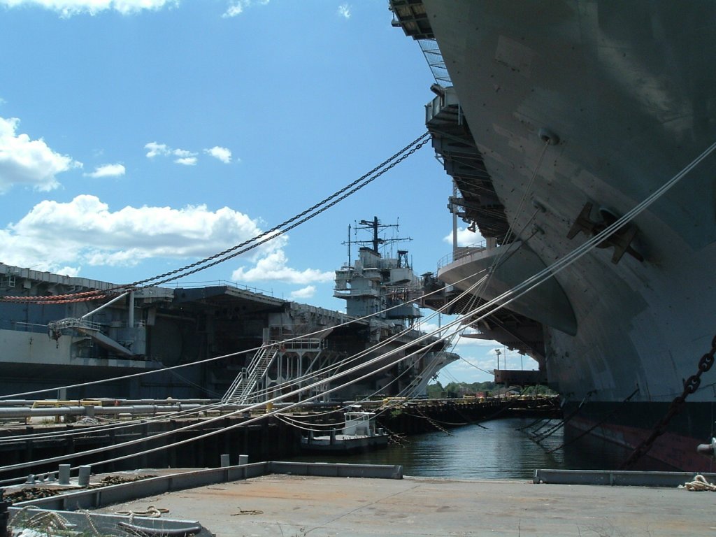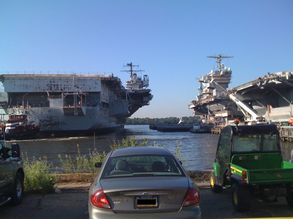 132k | Ex-USS Forrestal (AVT-59), left, and ex-USS John F. Kennedy (CV-67), Naval Support Activity Philadelphia, 2 July 2010. |