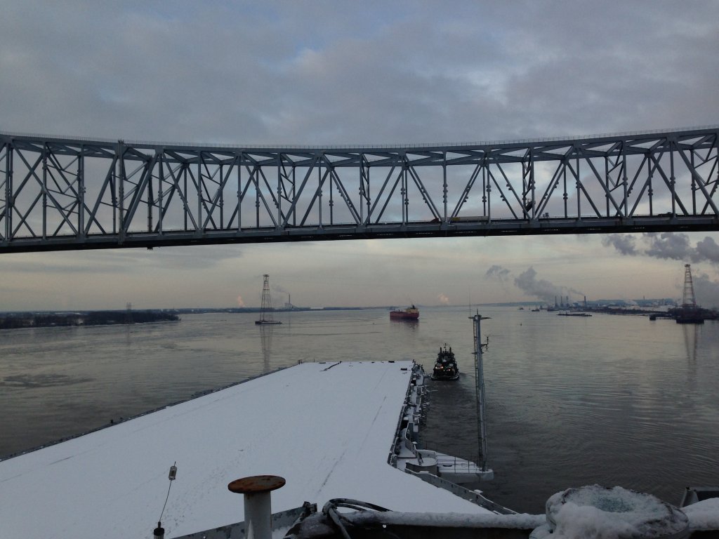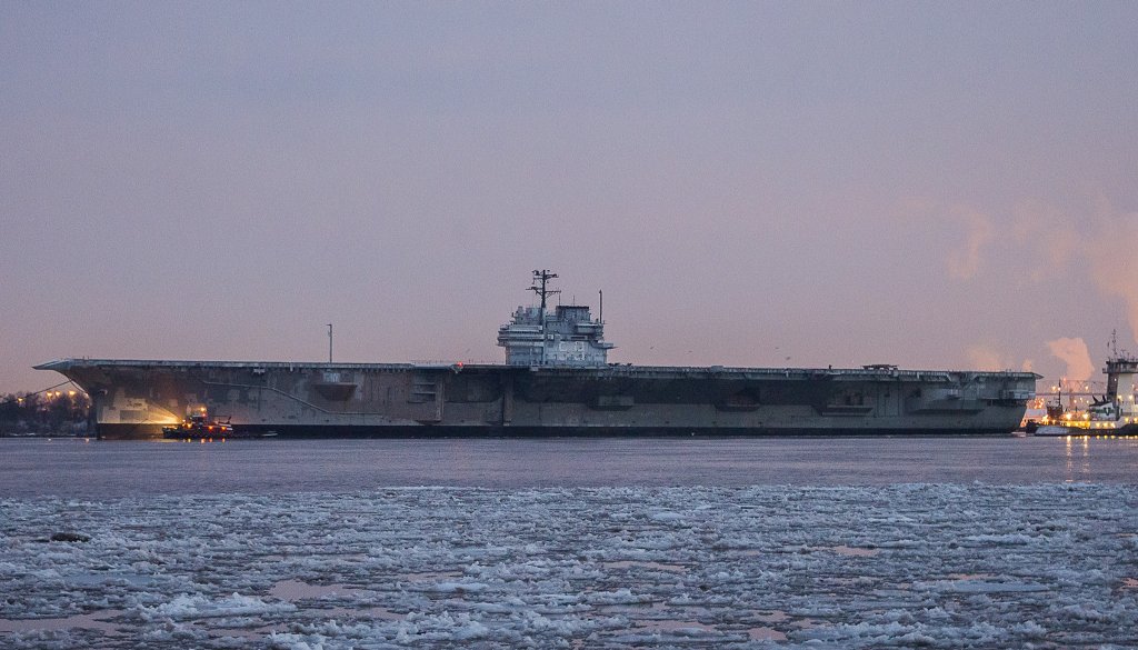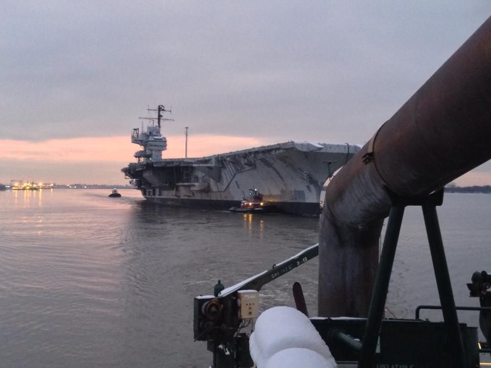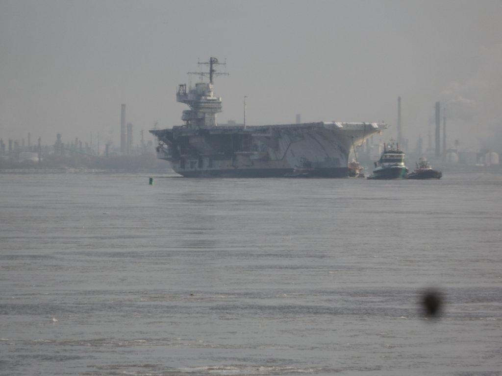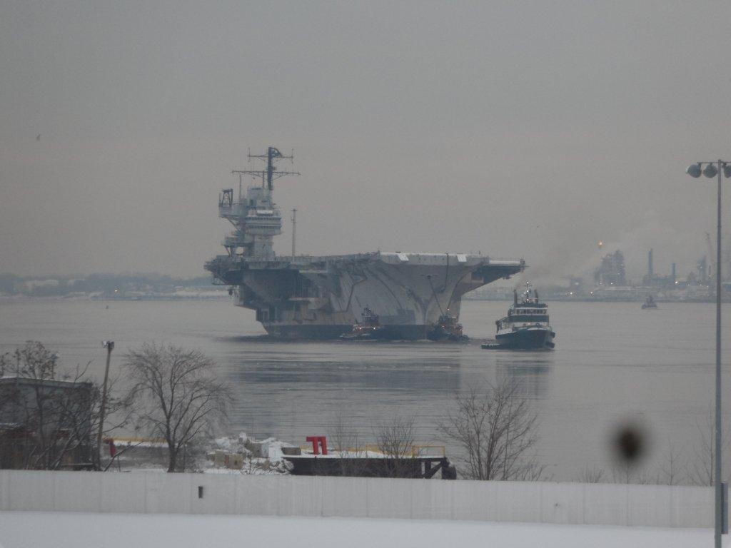 113k | Ex-Forrestal begins her last journey, from Philadelphia to Brownsville, TX, on the morning of 4 February 2014. |
