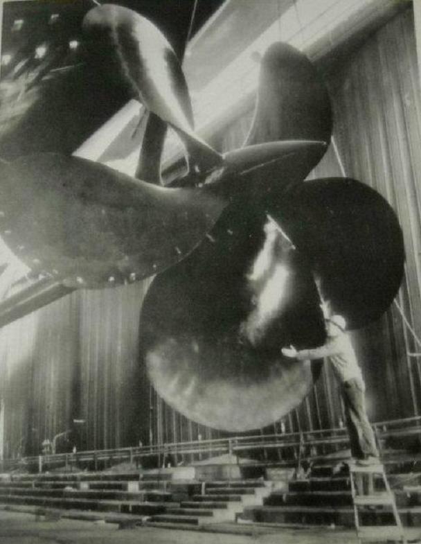 63k | "WAP 1075146 (61 751). . . . NEW YORK BUREAU" "ONE OF FORRESTAL'S FOUR PROPELLERS — NEWPORT NEWS, VA.:- A workman stands beside one of the huge five-bladed propellers of the giant carrier USS Forrestal, being readied for a Dec. 11th christening. Four of these screws will transmit the largest amount of power ever used to drive a ship, a total of more than 200,000 horsepower. Each propeller is 22 feet in diameter and is made in a single manganese bronze casting weighing more than 70,000 pounds. NX-A FTS MX AD EUR-8,10,11 RBC TV CREDIT (UNITED PRESS TEL'PHOTO) 12/10/54" |