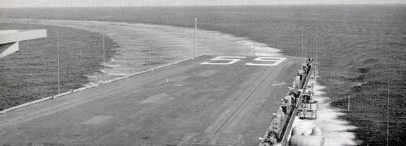 72k | "NXP21-12/16—WASHINGTON: This diagrammed blowup of a portion of the flight deck of the supercarrier, The Forrestal, illustrates how the Navy plans to move the bridge of the huge ship 22 feet to the starboard (it was originally announced that the shift would be 20 feet). The project will take 80,000 man-hours and roughly $1,000,000. The Navy, however, insisted in its announcement 12/16 it is 'not a major alteration' and certainly 'not a blunder.' Heavier catapults are being installed on the port side to counterbalance the massive shift of weight.(SEE NXP22) UNITED PRESS TELEPHOTO. we" |