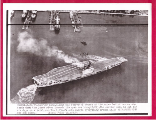 39k | "PORTS1-8/29/55-NEWPORT NEWS, VA: The USS Forrestal churns up the water behind her as she heads down the James River towards the open sea today (8/29). The carrier will be out for six days on a trial run. The 1,036-ft ship dwarfs everything around it. SP RETRANSMISSION FOR SAN DIEGO. UNITED PRESS TELEPHOTO" |