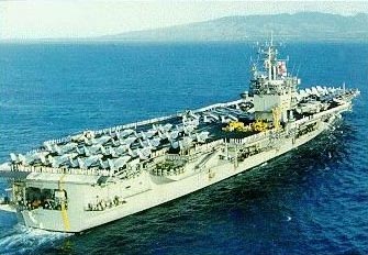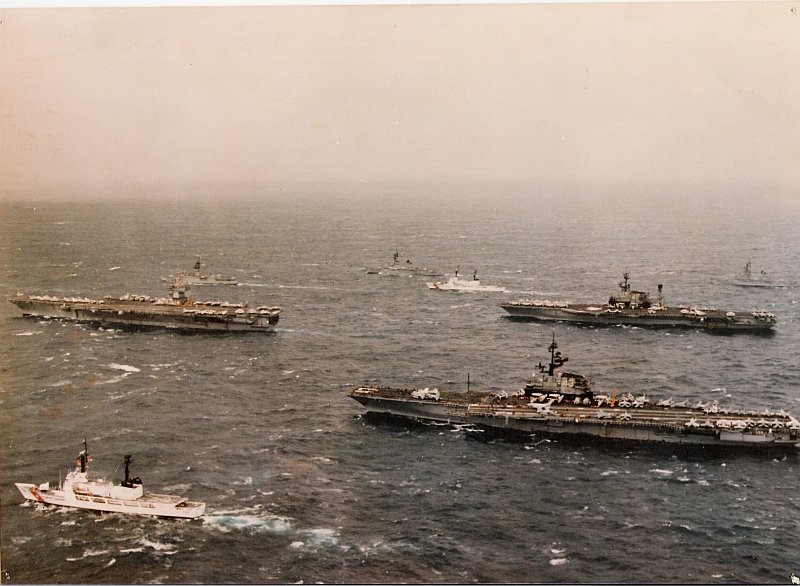 96k | Photo taken on 13 April 1983, during exercise FleetEx 83-1, in the North Pacific Ocean. The three carriers are, clockwise from left, USS Enterprise (CVN-65), USS Midway (CV-41), and USS Coral Sea (CV-43). Then LT Jim Petroski was aboard the Big E in the Reactor Dept., as RC division officer, and comments: "I spent some time up on the signal bridge during this photo op and got some great pictures of aircraft flying over us. Our air wing was the only one which could fly that day as the sea was quite rough—wave splashes were coming over the hurricane bow—and neither the Coral Sea nor Midway could launch/recover a/c. The frigate to starboard of "E" went up to 1/2 under in the waves, and the Coast Guard cutter to port came about 2/3 out of water. Quite a sight that day." "The April 13 date sounds correct. We were crossing and re-crossing the international date line a lot at that time. So some days were 46 hours long, and others were 2 hours long. It was easy to forget what day it was!" |