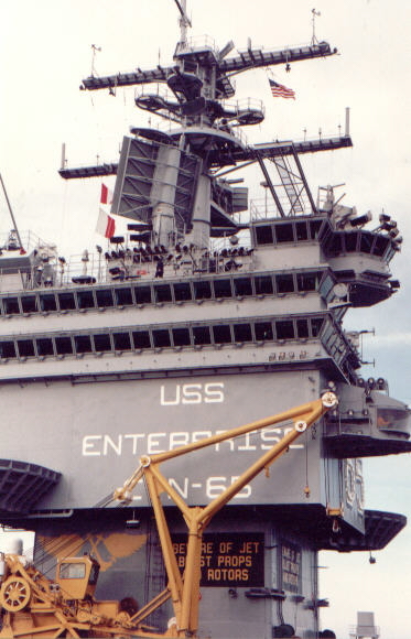 630k | A view of the island on USS Enterprise (CVN-65) as the ship was underway during sea trials off the coast of Washington state. The nuclear-powered aircraft carrier had been in dry dock for repairs and modifications. U.S. Navy photo by PH3 Cabral (# DN-SC-83-00336). Note: This photo is dated 4 February 1983 but this is probably incorrect, as The Big E was in the WestPac/Indian Ocean area on that date. Correct date is most likely 4 February 1982. |