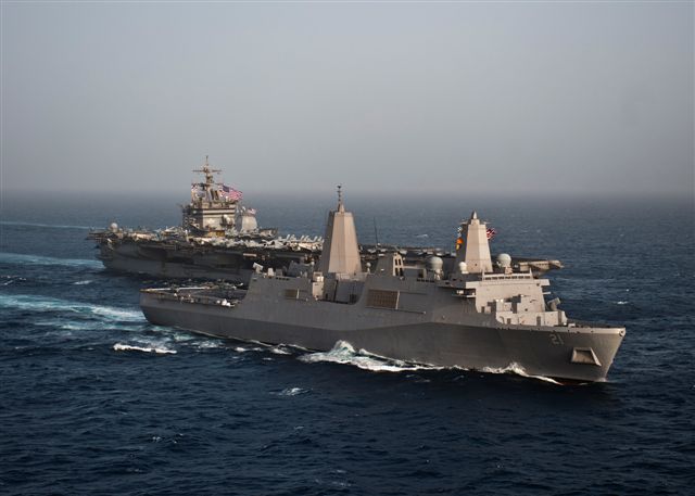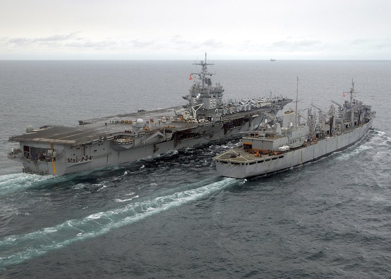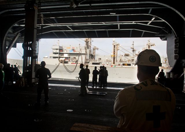 53k | Chief Aviation Support Equipment Technician David Thorne, assigned to the Safety Department aboard USS Enterprise (CVN-65), observes a replenishment at sea with Military Sealift Command (MSC) fast combat support ship USNS Supply (T-AOE 6), 12 September 2012. Enterprise was deployed to the U.S. 5th Fleet Area Of Responsibility conducting maritime security operations, theater security cooperation efforts and support missions as part of Operation Enduring Freedom. US Navy photo by Mass Communication Specialist 3rd Class Scott Pittman (# 120912-N-FI736-013). |