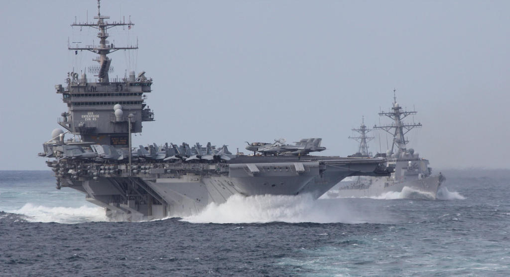 512k | USS Enterprise (CVN-65) approaches Military Sealift Command dry cargo and ammunition ship USNS Sacagawea (T-AKE 2) before a vertical replenishment and Enterprise's final ammunition offload, 24 October 2012. US Navy photo by Mass Communication Specialist 3rd Class Jared King (# 121024-N-CH661-019). |