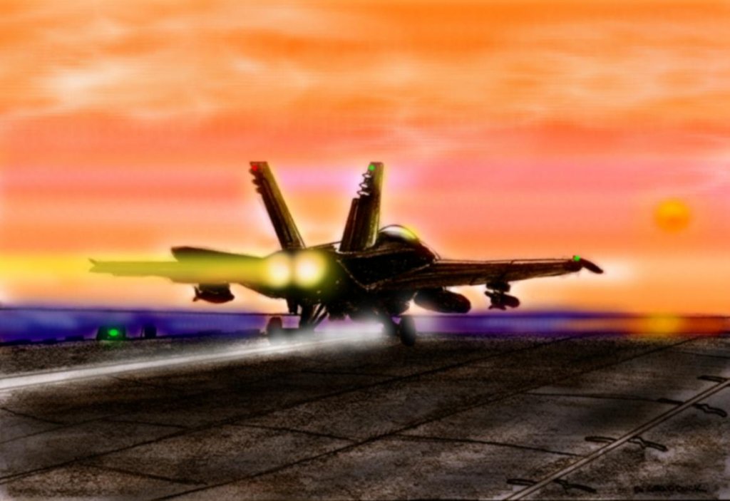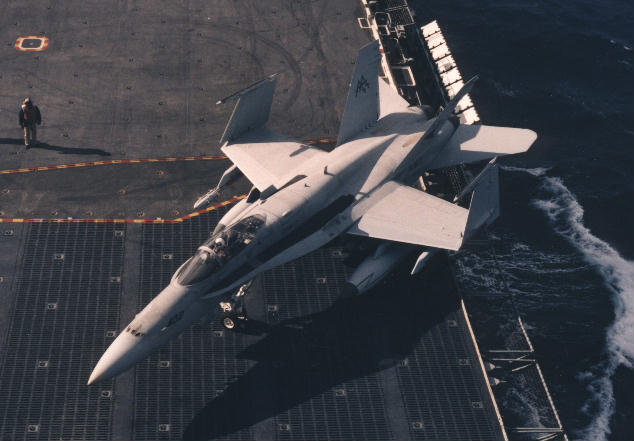 273k | LtCol Simon Doran, commanding officer of the "Thunderbolts" of Marine Fighter Attack Squadron (VMFA) 251, launches in an F/A-18C(N) Hornet (BuNo 164979, modex AB-401) from the flight deck of USS Enterprise (CVN-65) in the Arabian Sea, 8 September 2012. The aircraft carrier was deployed to the U.S. 5th Fleet area of responsibility conducting maritime security operations, theater security cooperation efforts and support missions as part of Operation Enduring Freedom. The second Hornet, in the background, appears to be BuNo 164950, modex AB-407. U.S. Navy photo by Mass Communication Specialist 3rd Class Jared King (# 120908-N-CH661-088). |