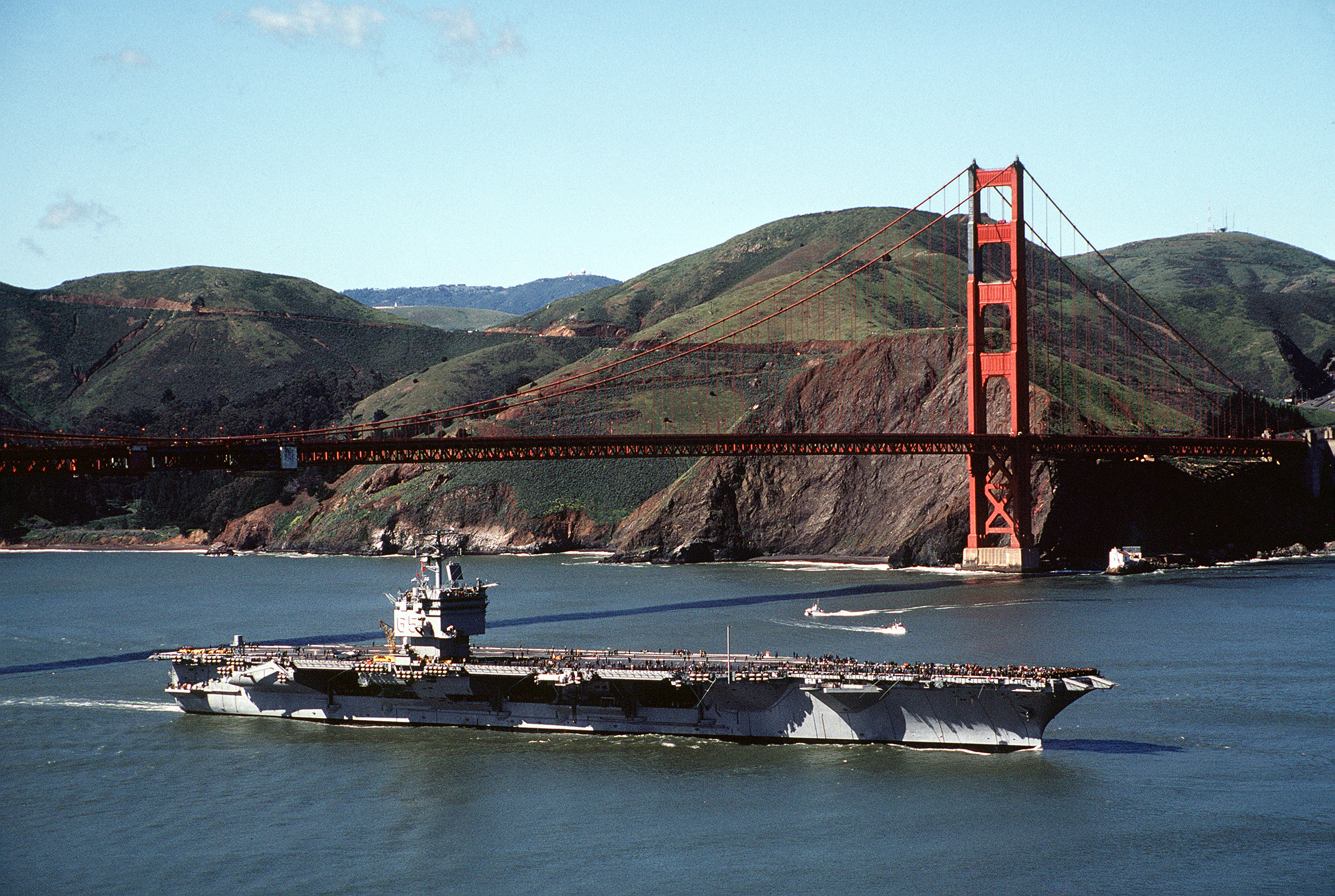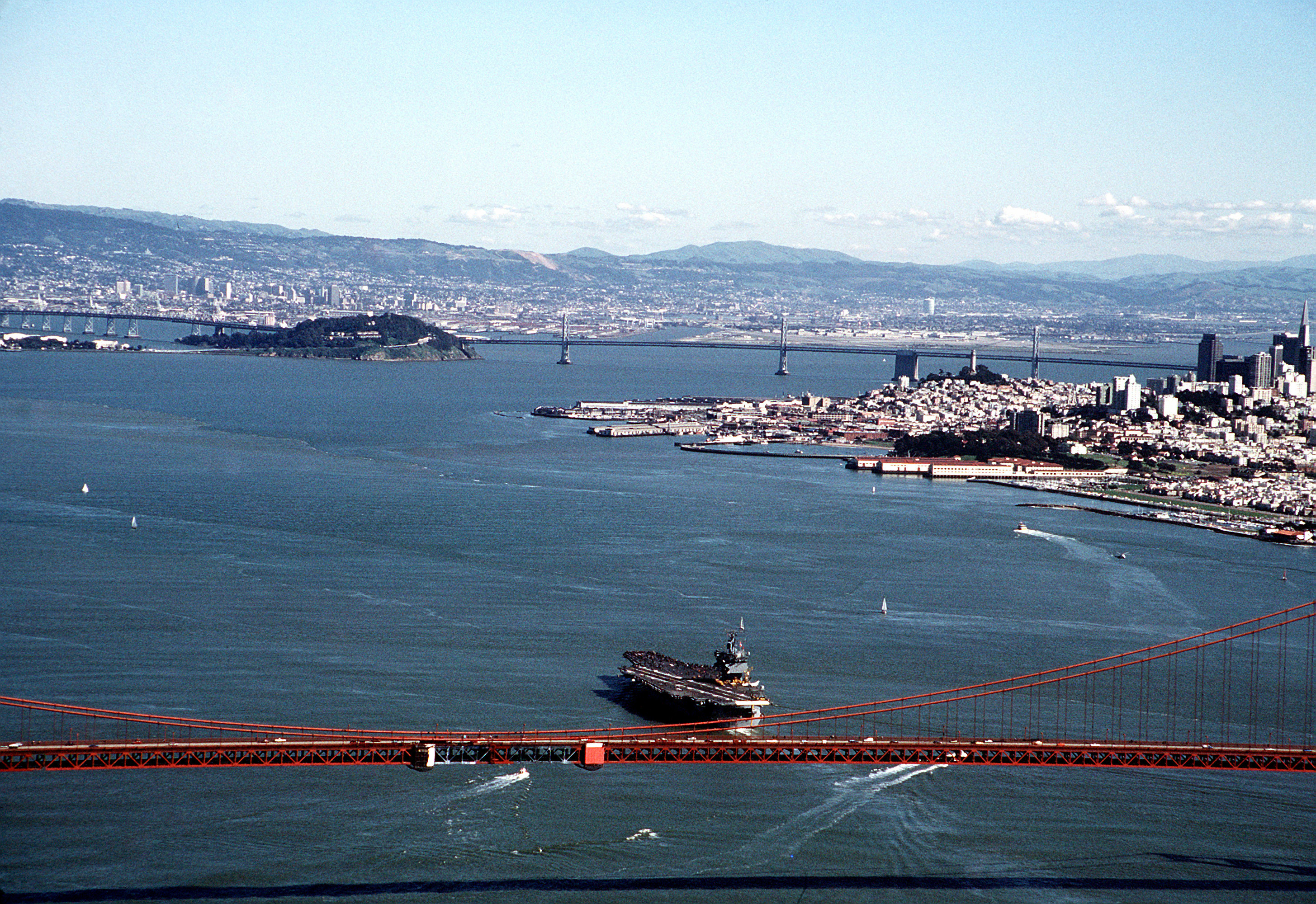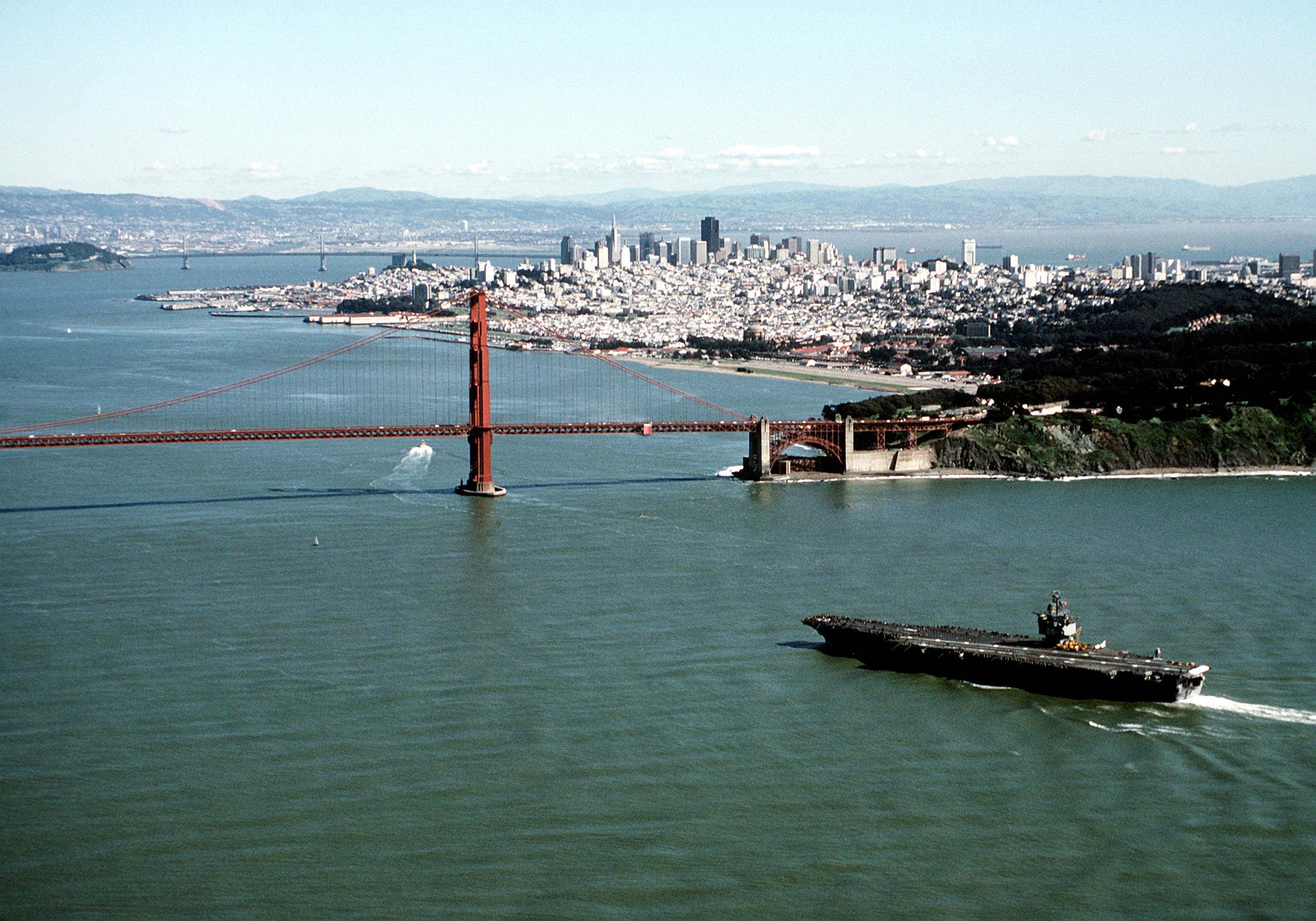 140k | A starboard beam view of USS Enterprise (CVN-65) approaching the entrance to the San Francisco Bay, 4 March 1982. US Navy photo by PH3 Curt Fargo (DVIC id: DN-ST-82-05108). |