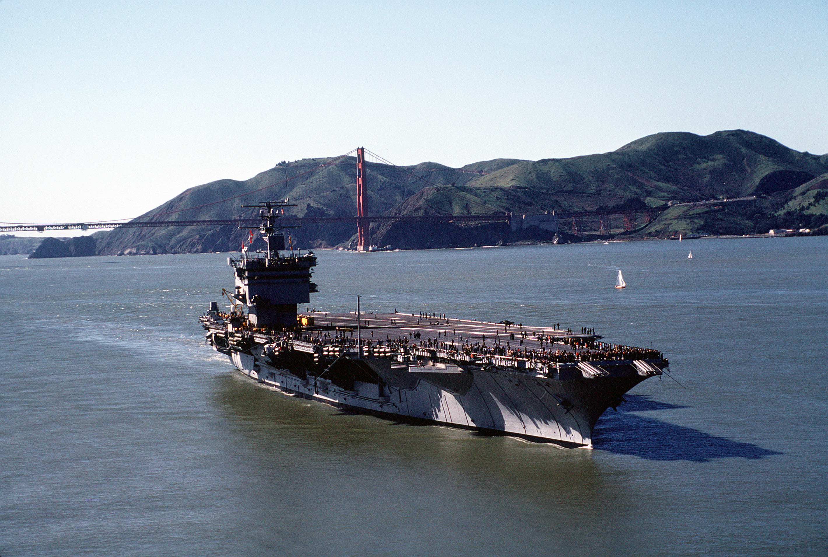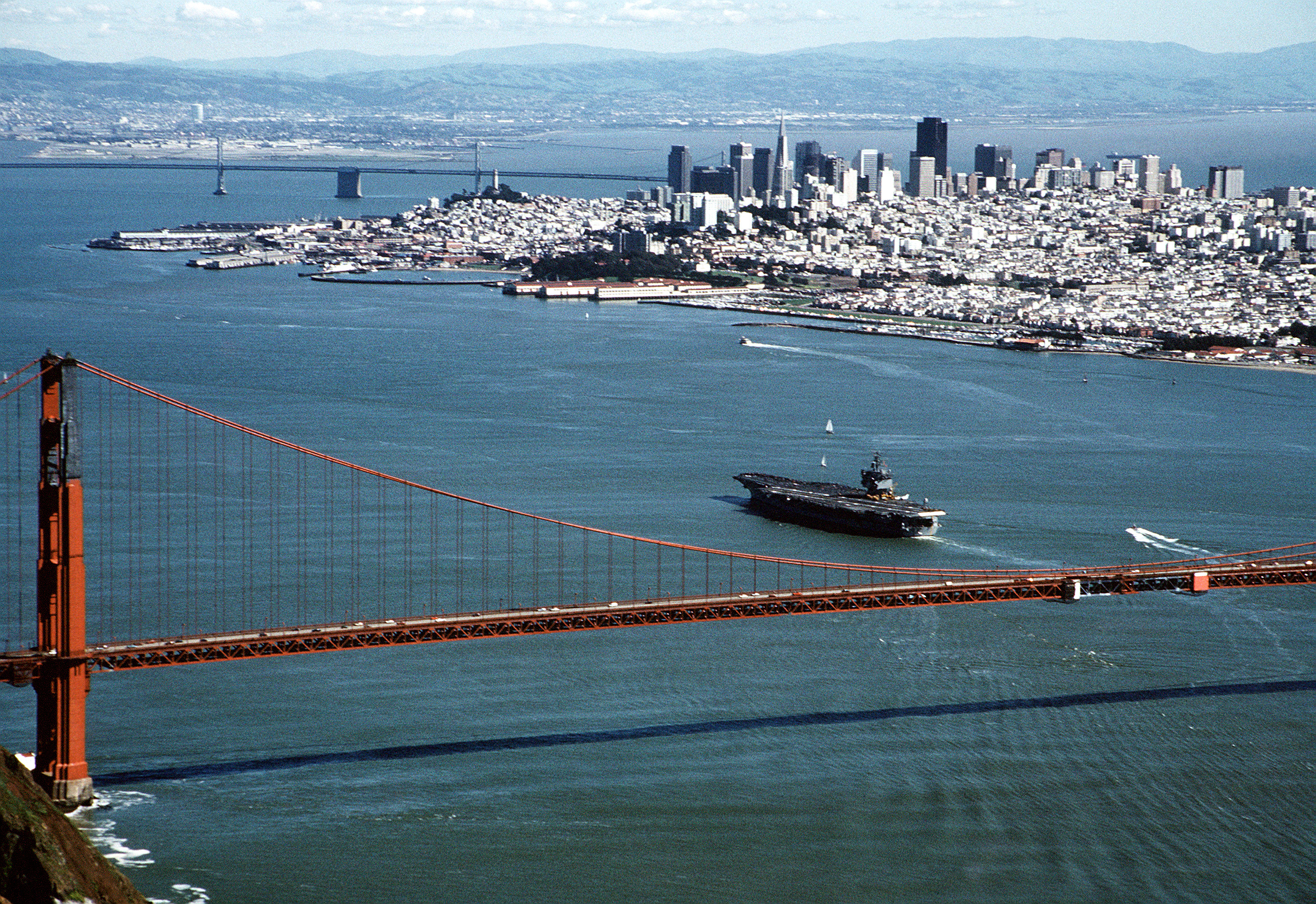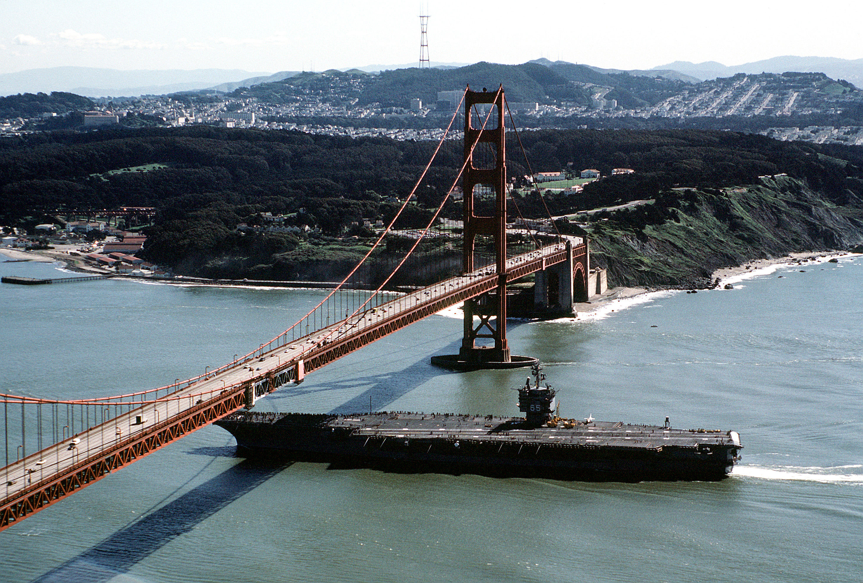 140k | A starboard beam view of USS Enterprise (CVN-65) approaching the entrance to the San Francisco Bay, 4 March 1982. US Navy photo by PH3 Curt Fargo (DVIC id: DN-ST-82-05108). |