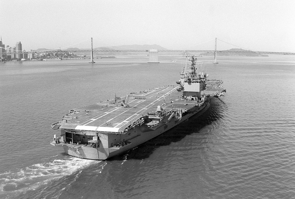 167k | Aerial starboard quarter view of USS Enterprise (CVN-65) underway for a Western Pacific deployment, September 1, 1982. The San Francisco-Oakland Bay Bridge is visible in the background. US Navy photo by PHAN Watts (DVIC id: DN-SN-85-07563). |