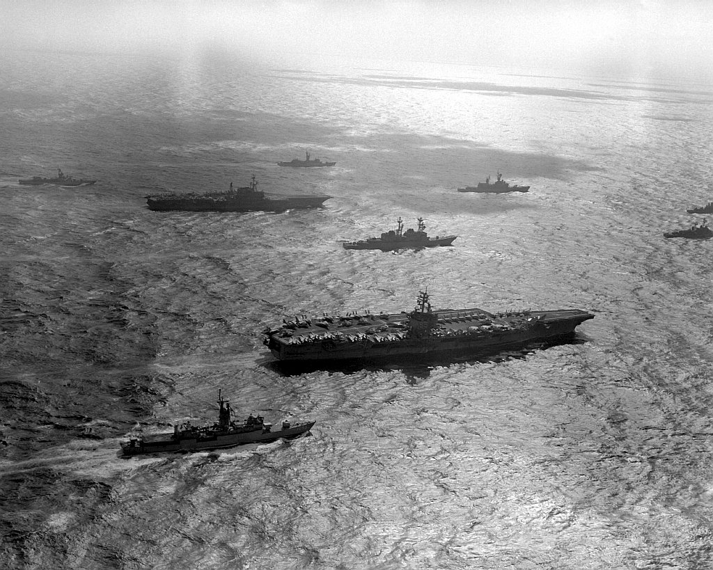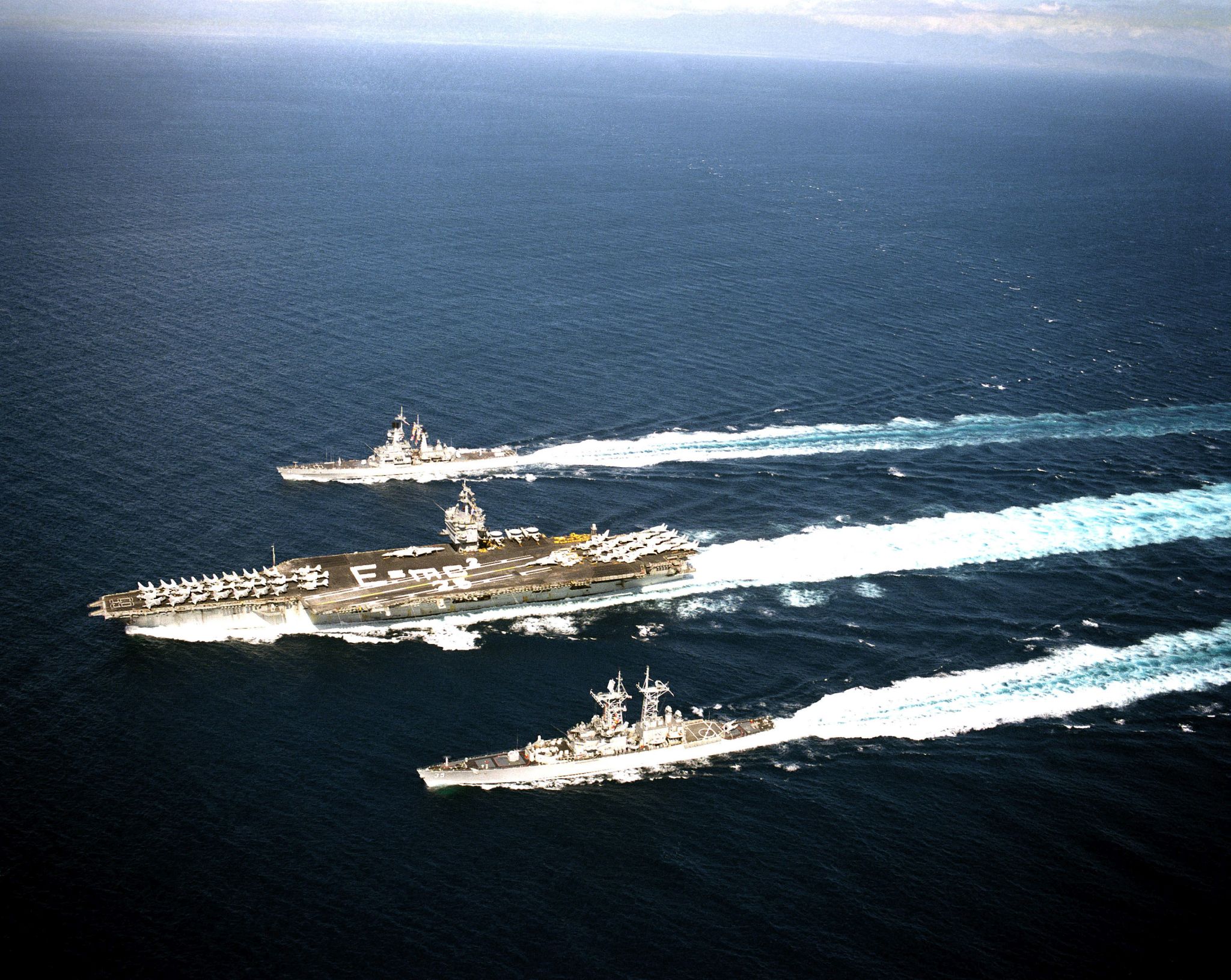 245k | Aerial starboard side view of the nuclear-powered aircraft carrier USS Enterprise (CVN-65) and the aircraft carrier USS Midway (CV-41), background, underway with their task groups. The frigate USS Hepburn (FF-1055) is underway in the foreground. Pacific Ocean, October 1982. US Navy photo by PHAN Mellendorf (DVIC id: DN-SN-85-07596). |