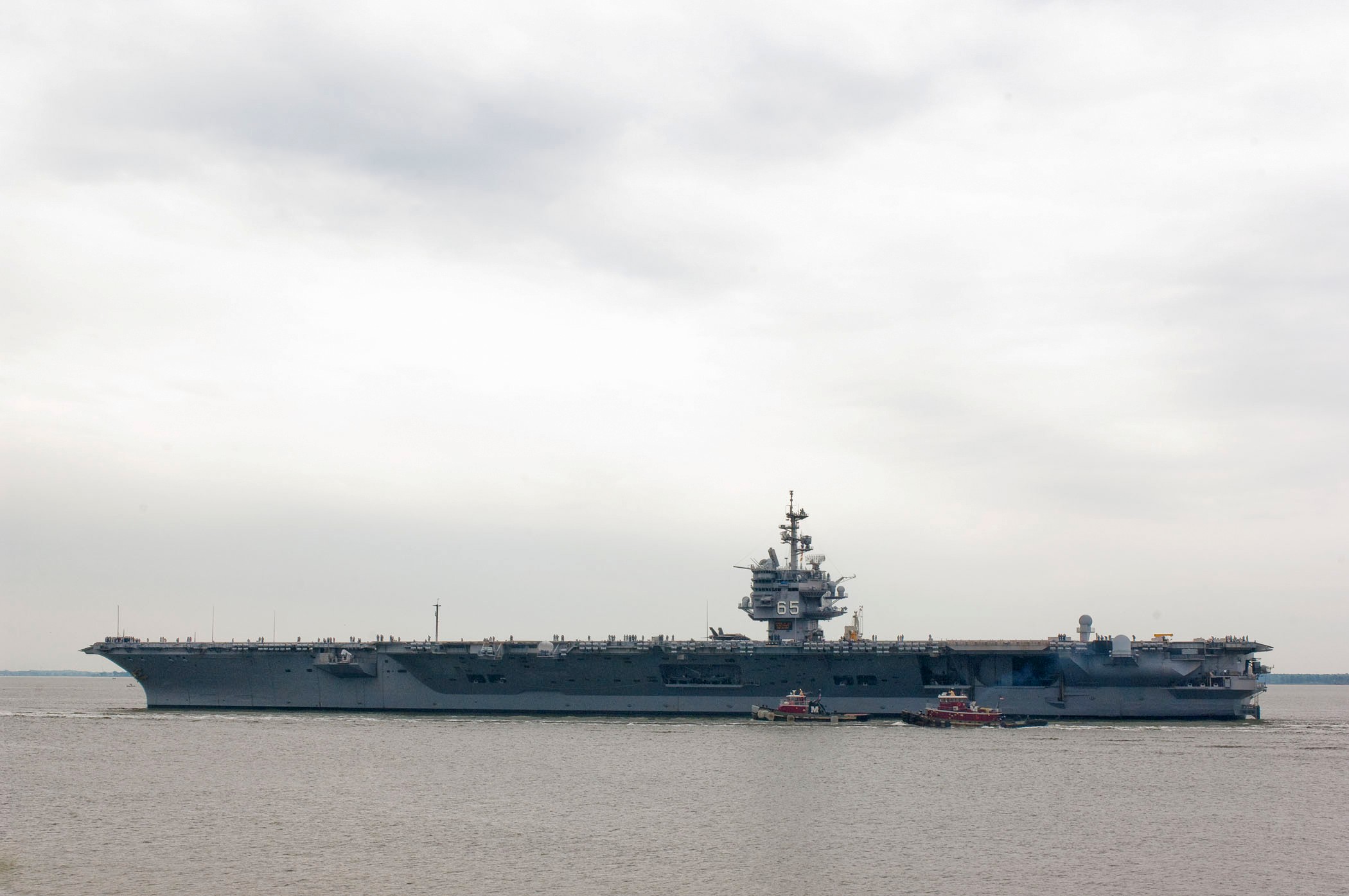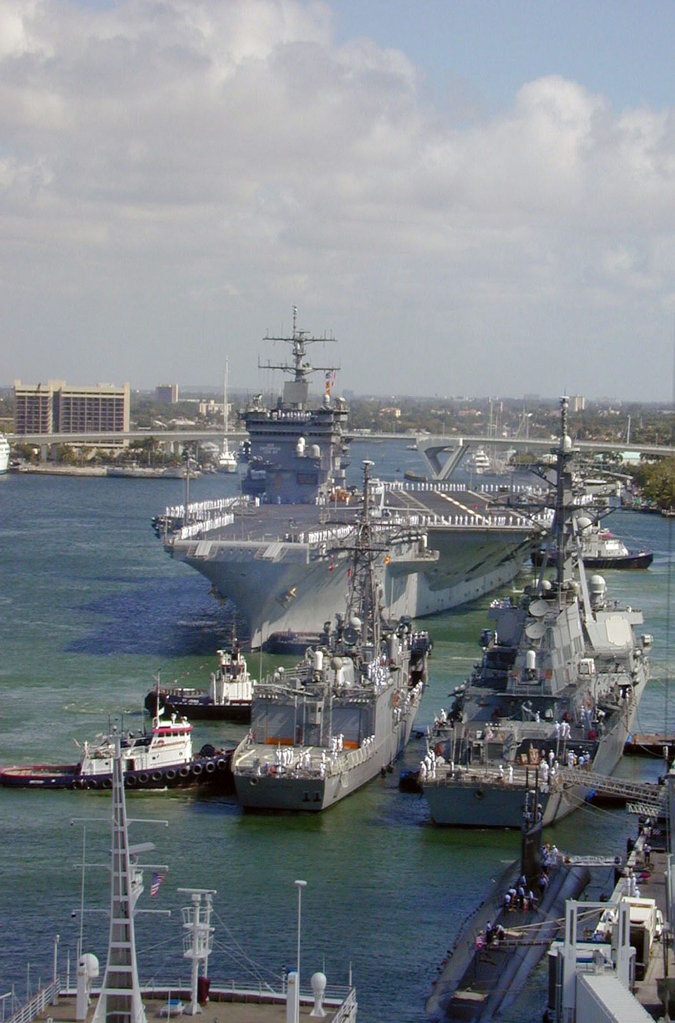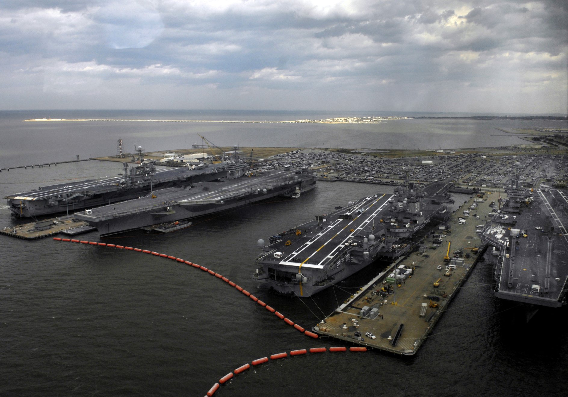 537k | Naval Station Norfolk, 19 December 2012. Ships are, right to left: USS Dwight D. Eisenhower (CVN-69), USS George H.W. Bush (CVN-77), ex-USS Enterprise (CVN-65), USS Bataan (LHD-5), USS Abraham Lincoln (CVN-72), USS Harry S. Truman (CVN-75), and USS Wasp (LHD-1). U.S. Navy photo by Mass Communication Specialist 3rd Class Kevin J. Steinberg, # 121219-N-TB177-875. |
