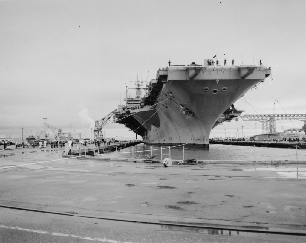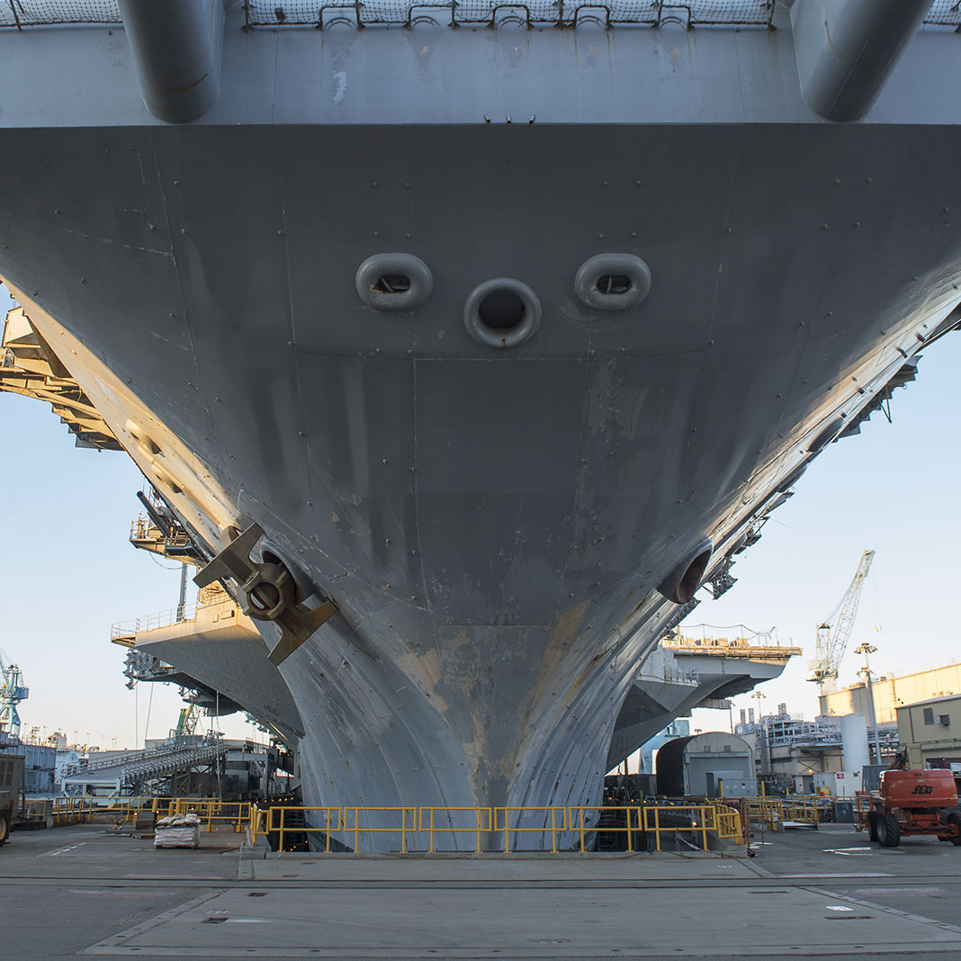 230k | The bow of the former USS Enterprise, February 2016, in Dry Dock 11, Newport News, VA, where she was built over 50 years earlier. Photo ©Huntington Ingalls Industries (# DCS16-100), by Ricky Thompson. |