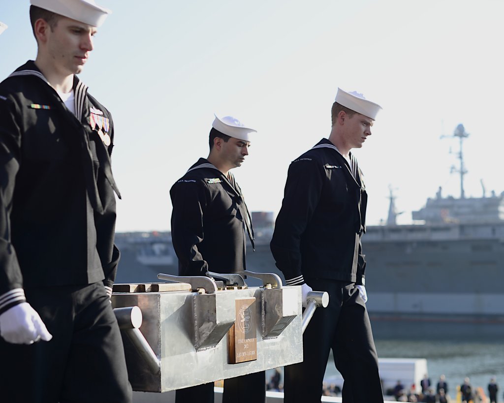 100k | Sailors assigned to the aircraft carrier USS Enterprise (CVN-65) carry a time capsule filled with messages and mementos for the crew of the next ship to carry the Enterprise name during the ship's inactivation ceremony. The Big E was commissioned in 1961 and inactivated in 2012, after 51 years of service. U.S. Navy photo by Mass Communication Specialist 2nd Class Brooks B. Patton (# 121201-N-JL826-239). |