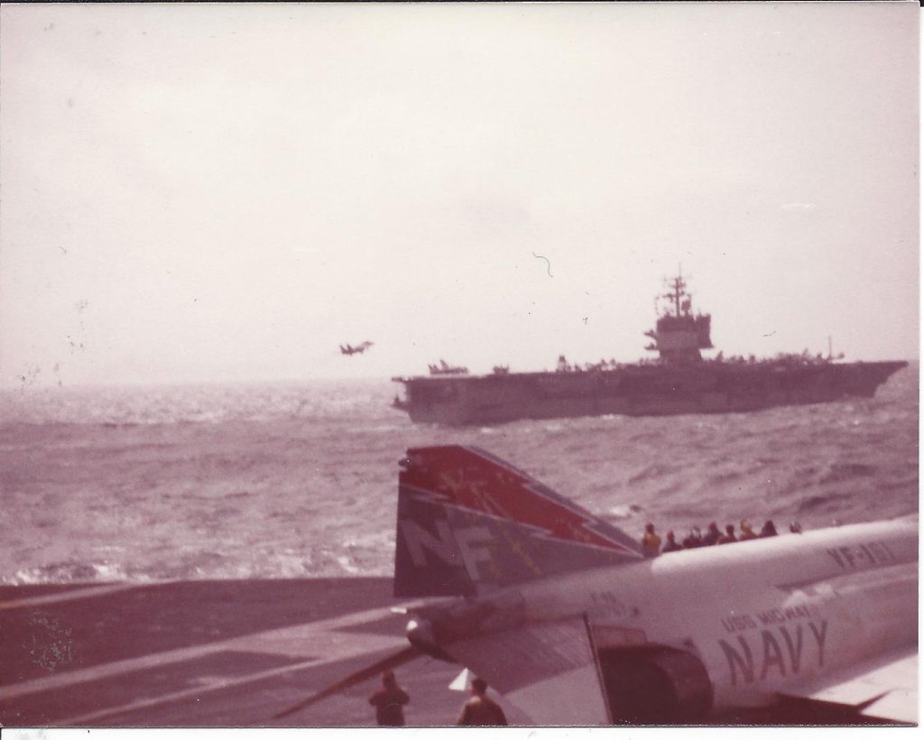 82k | F-14 Tomcat recovering aboard USS Enterprise (CVN-65), NORPAC 82, as seen from USS Midway (CV-41). |