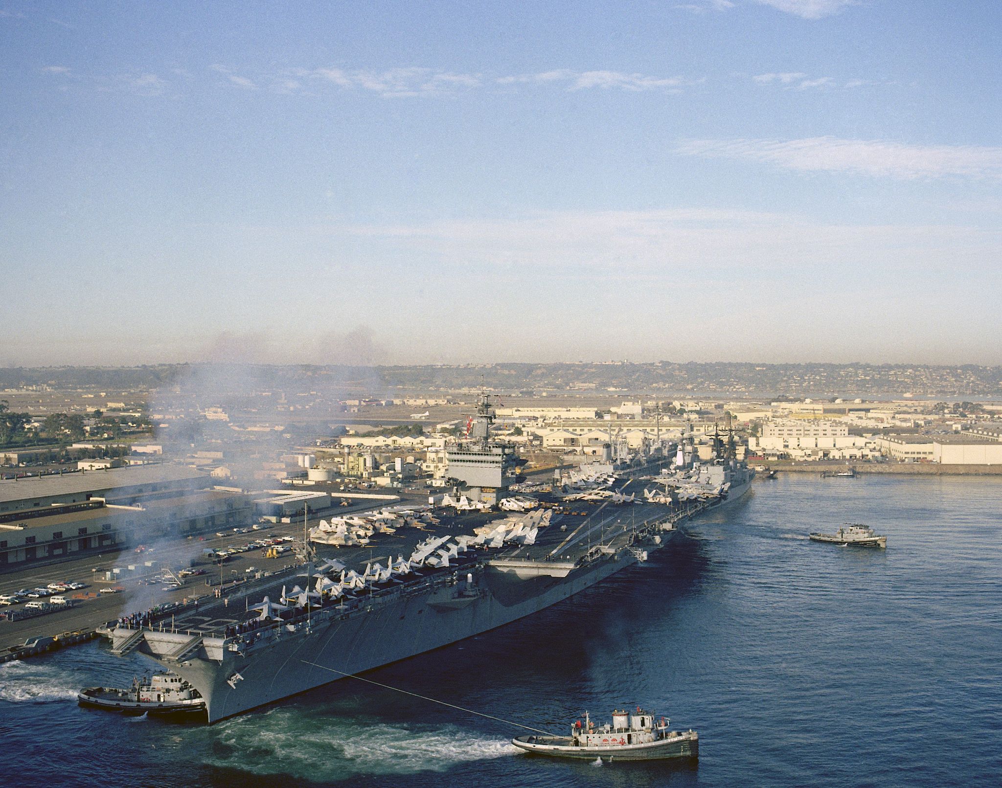 657k | USS Enterprise (CVN-65) departing Naval Air Station, North Island, San Diego, California, second half of January 1984. Two large harbor tugs are assisting the carrier. U.S. Navy photo by PH1 Bennett (# DN-SC-85-07382). |