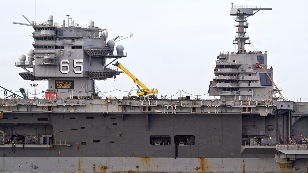 632k | Newport News Shipbuilding, 3 October 2018. Ex-USS Enterprise (CVN-65)—closer to camera—, and USS Gerald R. Ford (CVN-78) undergoing her post-shakedown availability. Huntington-Ingalls Industries-Newport News Shipbuilding (HII-NNS) photo by Ashley Cowan. |