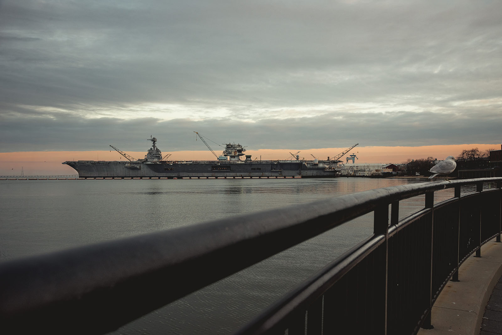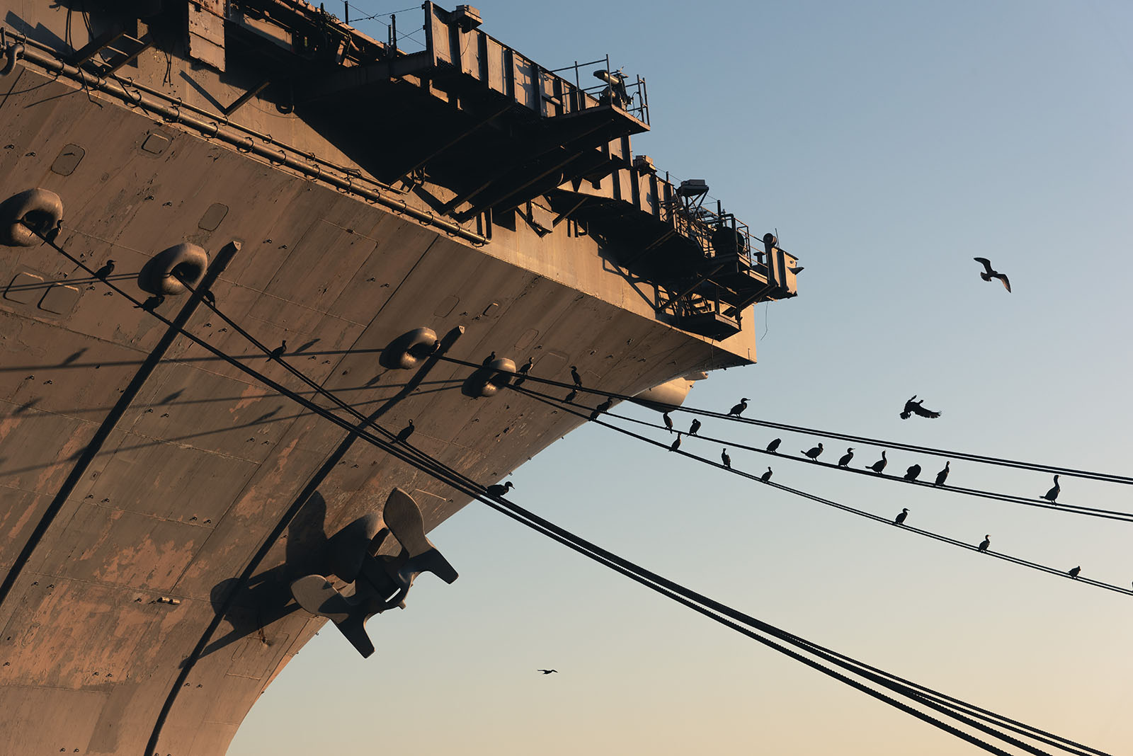 271k | Birds rest on the lines securing the former aircraft carrier Enterprise (CVN-65) to Pier 2. Photo by Matt Hildreth, 2 April 2020. |