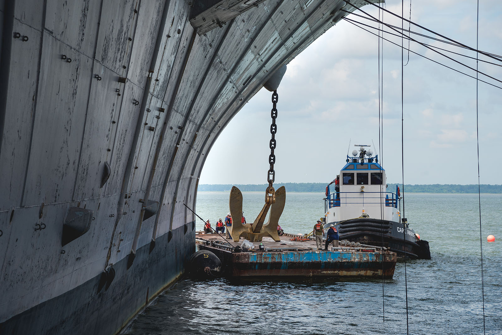 374k | Decommissioned ex-USS Enterprise (CVN-65) surrenders her anchor to be used on USS George Washington (CVN-73), which is nearing completion of her RCOH in Dry Dock 11. Photo by Matt Hildreth, 25 June 2019 (# DCS19-360-181). |