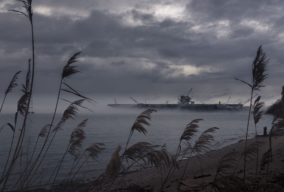 135k | The former aircraft carrier ex-USS Enterprise (CVN-65) enveloped by fog, 12 January 2018. Huntington-Ingalls Industries-Newport News Shipbuilding (HII-NNS) photo by Matt Hildreth. |