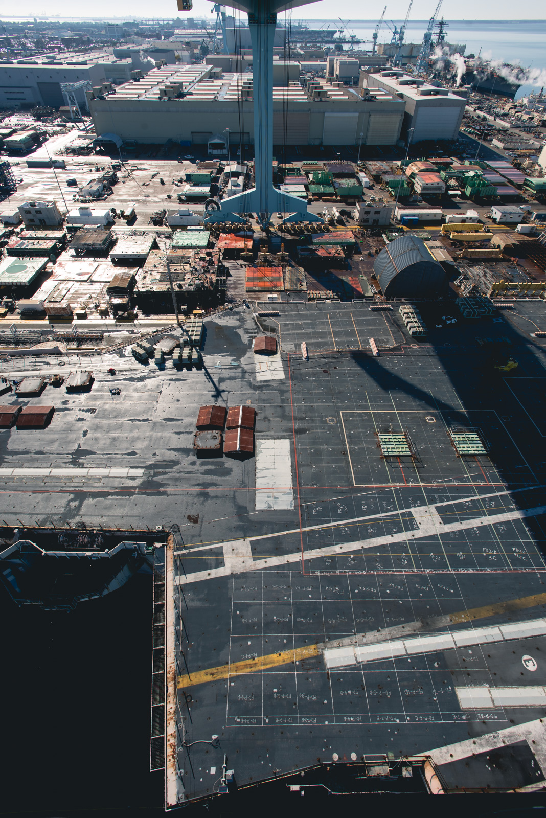 862k | The flight deck of ex-Enterprise (CVN-65), in Dry Dock 12, rests next to units being constructed for the new aircraft carrier Enterprise (CVN-80), 23 February 2021. Photo by Ashley Cowan. |