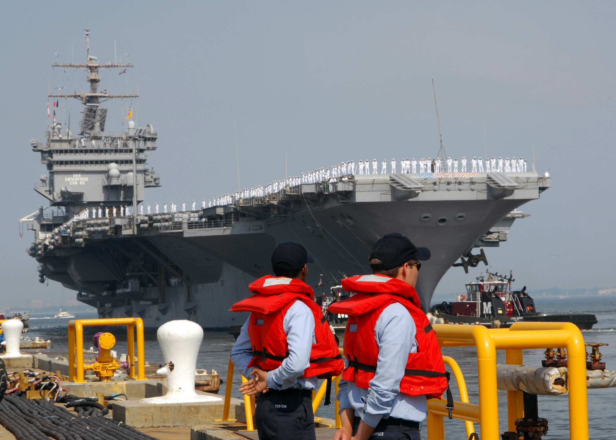 449k | Ex-USS Enterprise (CVN-65) makes her final voyage to Newport News Shipbuilding, 20 June 2013. The first nuclear-powered aircraft carrier would be dismantled at the shipyard prior to the scheduled commissioning of the next aircraft carrier Enterprise (CVN-80). U.S. Navy photo courtesy of Huntington Ingalls Industries by John Whalen (# 130620-N-ZZ999-101). |