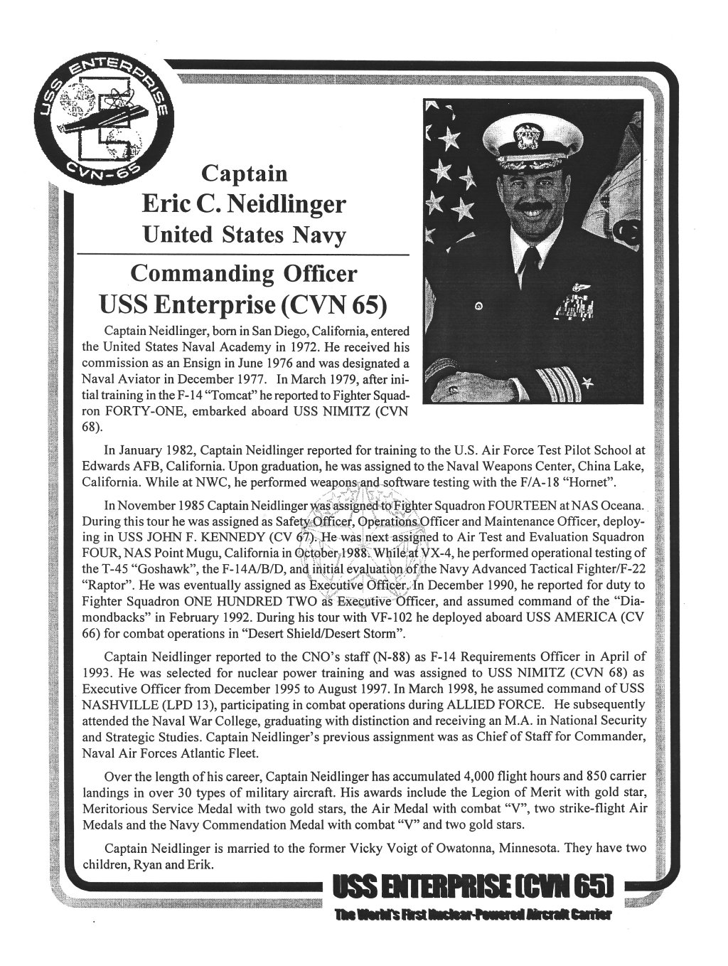 | Captain Eric Christian Neidlinger [Biography] | USNA 1976 | 15 Feb 2002 - 10 Dec 2004 | |