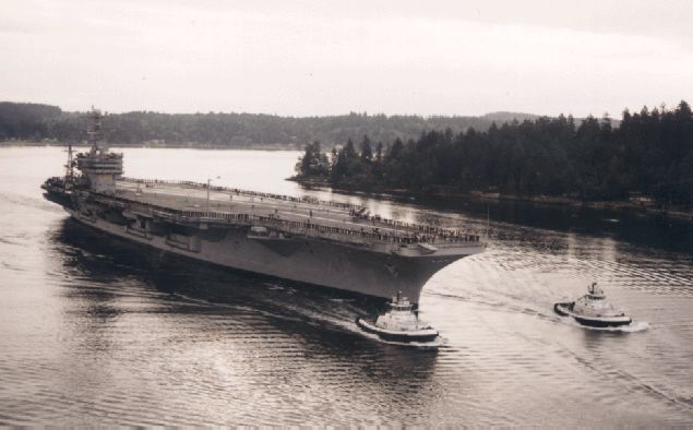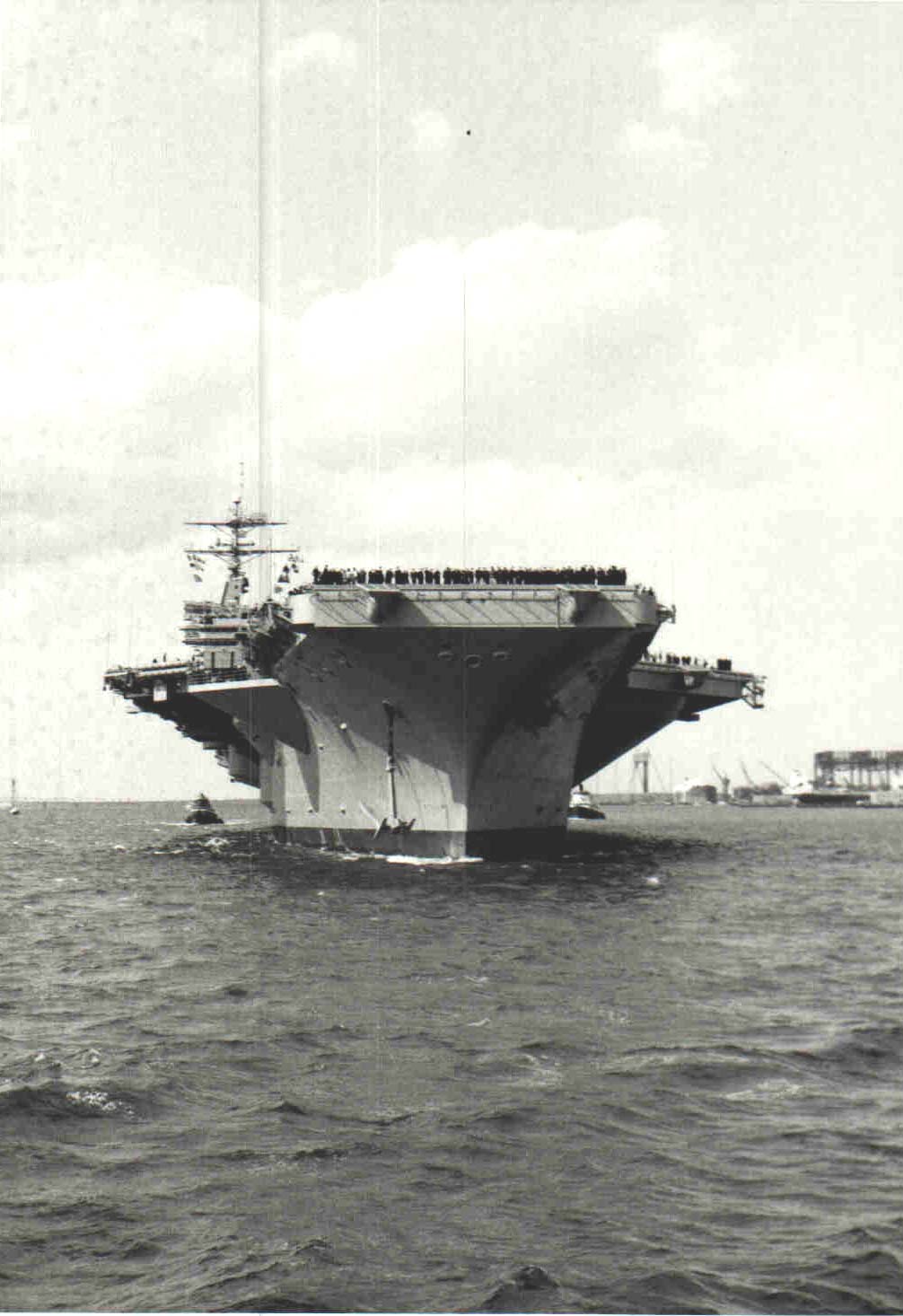 58k | USS Nimitz (CVN-68) being assisted by tugs to her home berth, September 24, 1975 after a deployment to the North Atlantic with Nuclear Task Force (TF) 75, which comprised the guided missile cruiser USS South Carolina (CGN-37) and the attack submarine Seahorse (SSN-669). |