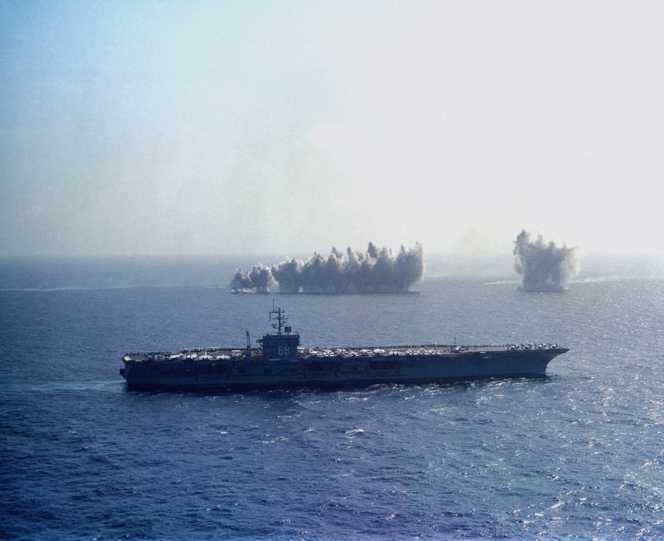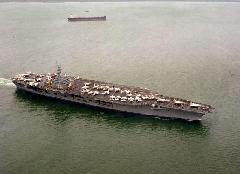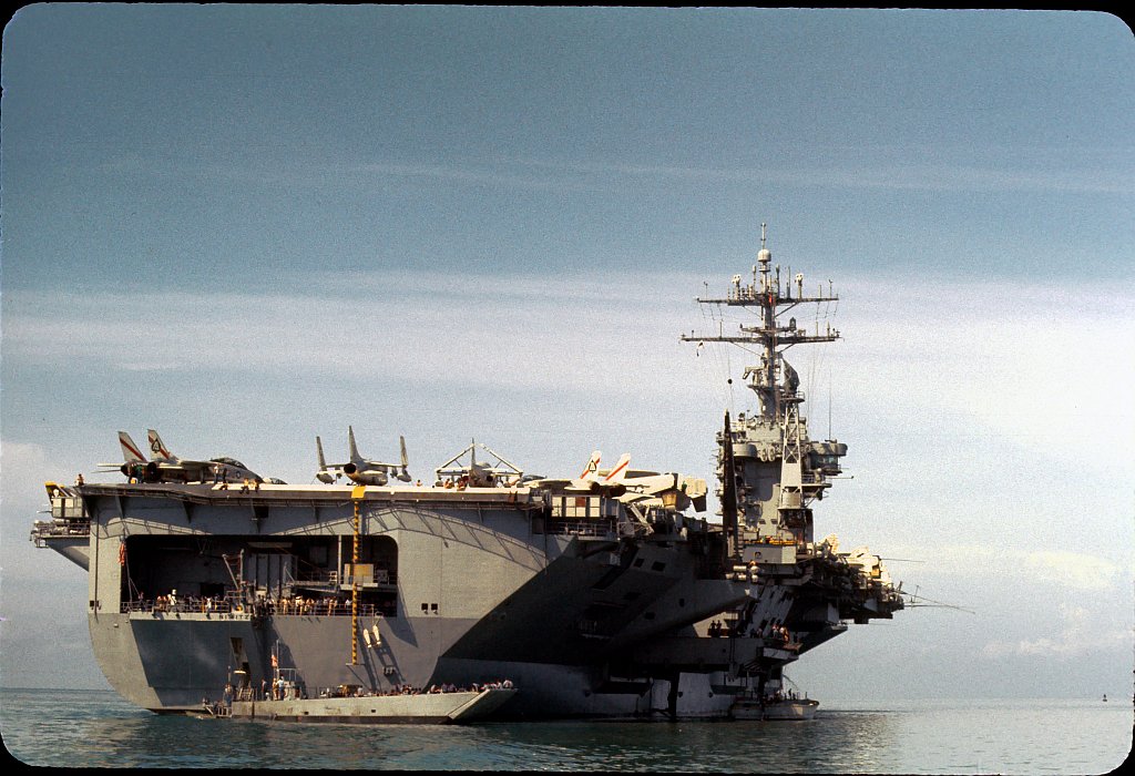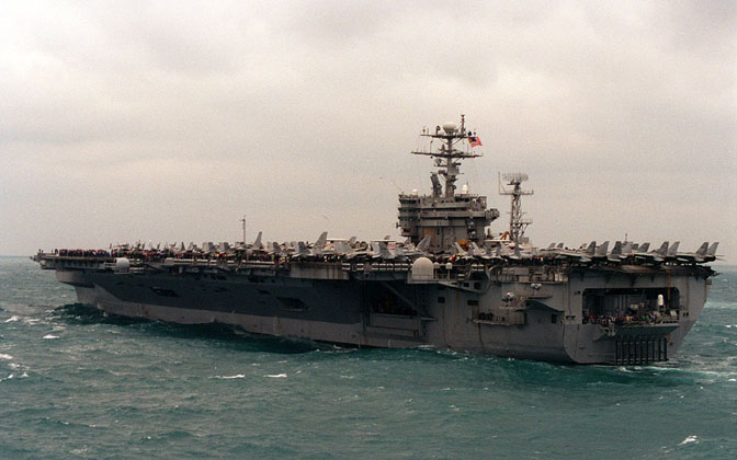 714k | USS Nimitz (CVN-68) underway in the Persian Gulf with Carrier Air Wing (CVW) 9, 23 March 1993, enforcing the no-fly zone against Iraq on the first day of Operation Southern Watch. US Navy photo by PH2 Tim Tow. Naval History & Heritage Command (NH&HC), photo # NH 106554-KN. |