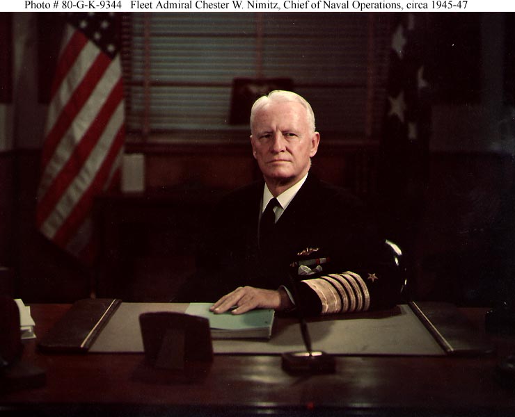 50k | CVN-68 is named after Fleet Admiral Chester William Nimitz, USN, (1885-1966). Following the destructive 7 December 1941 Japanese attack on Pearl Harbor, Nimitz took over the Pacific Fleet. With the rank of Admiral, and Fleet Admiral after December 1944, he commanded American forces during their long advance across the Pacific to full victory in August 1945. Fleet Admiral Nimitz was Chief of Naval Operations (CNO), 15 December 1945-15 December 1947. |