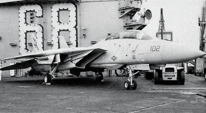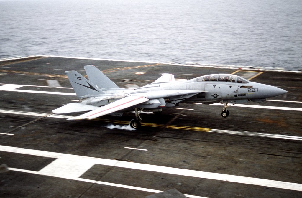 130k | A Grumman F-14A Tomcat aircraft from Fighter Squadron (VF) 24 "Fighting Renegades" recovers aboard USS Nimitz (CVN-68). Date is given as 15 June 1992, but this may be incorrect. USN photo by PH2 Bruce Trombecky, USNR-R. DOD ID:DNST9301582. |