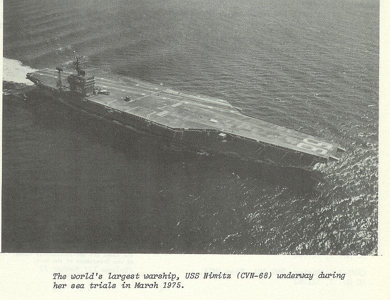 137k | "The world's largest warship, USS Nimitz (CVN-68) underway during her sea trials in March 1975." From the NAVSEA Journal. |